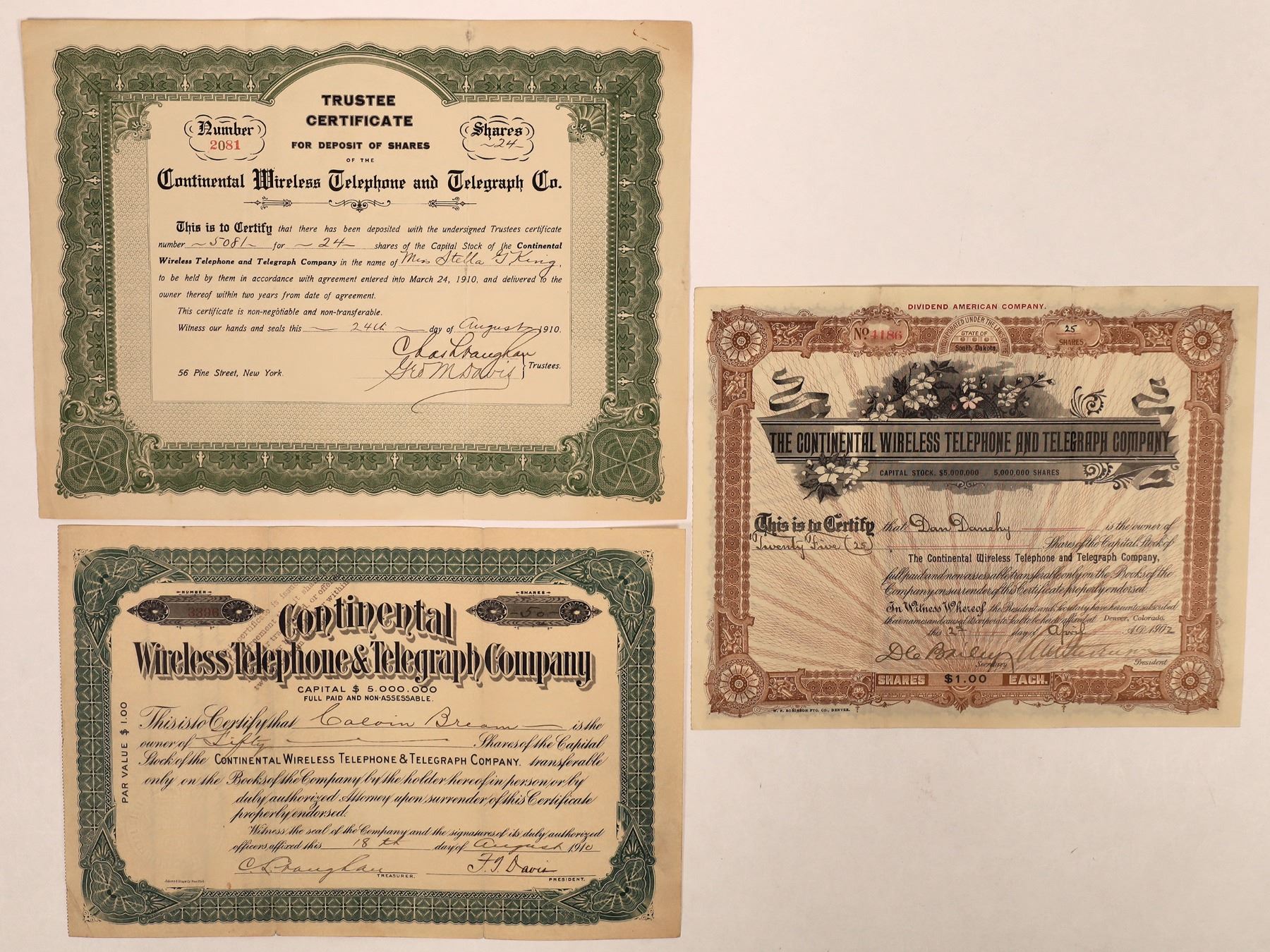 Lot of 3 different. 1) Inc. in South Dakota. No. 4186, issued for 25 shares in 1902 in Denver. Signed by the president and secretary. Not cancelled. Brown border, black print, and floral vignette. 2) No. 3396, issued for 50 shares in 1910. Signed by president Davis and the treasurer. Not cancelled. Green border, black print. 3) Trustee Certificate issued in 1910 for 24 shares to Mrs. Stella King. Not cancelled. Green border, black print. Consolidation of: Collins Wireless Telephone, Pacific Wireless Telegraph, Clark Wireless Telegraph & Telephone, and Massie Wireless Telegraph. Associated with A. Frederick Collins, who was a prominent early American experimenter in wireless telephony and prolific author of books and articles covering a wide range of scientific and technical subjects. His reputation was tarnished in 1913 when he was convicted of mail fraud related to stock promotion.