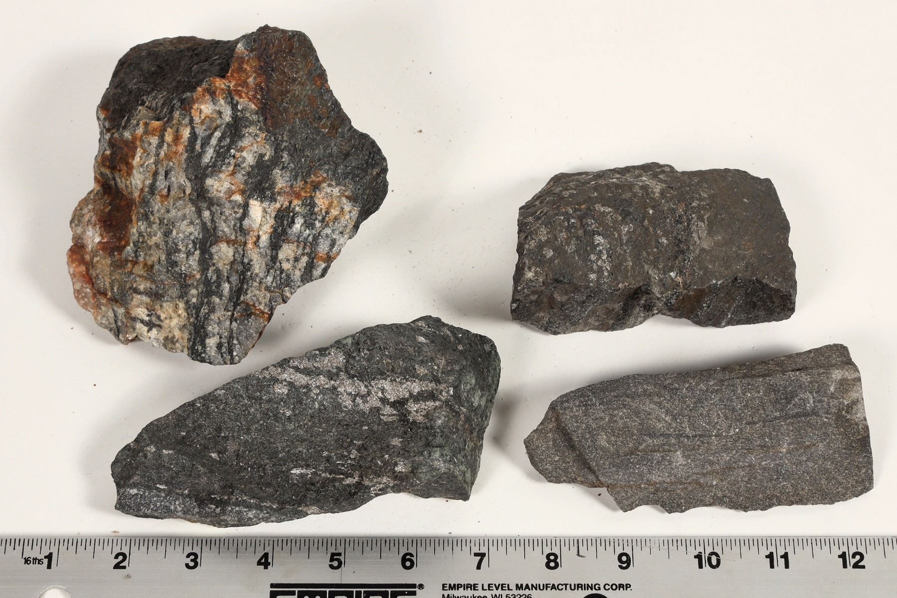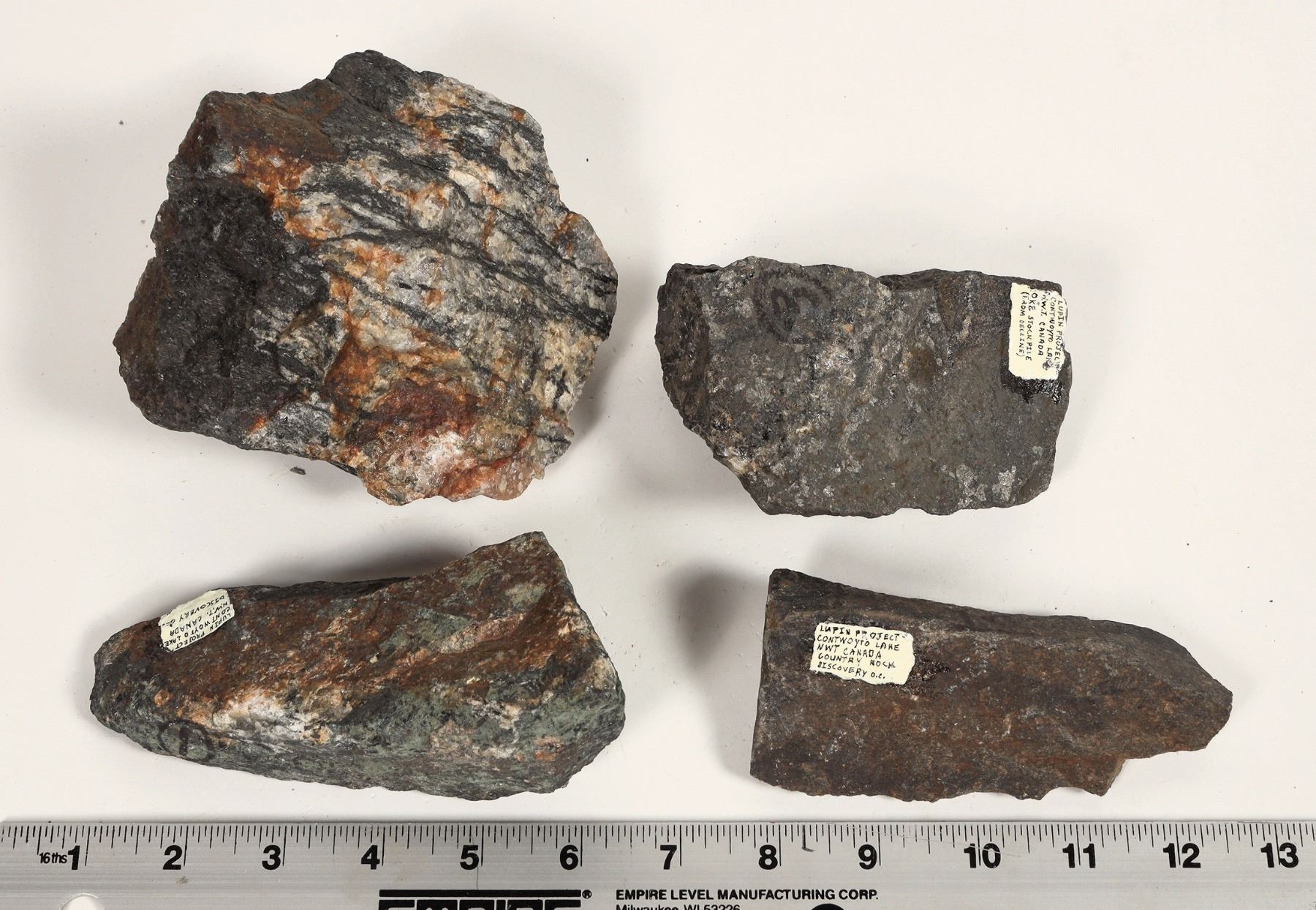 Contwoyto Lake. Four large hand specimens from the discovery outcrop. Possible visible native gold. There are a number of mines in this area, including a diamond mine.