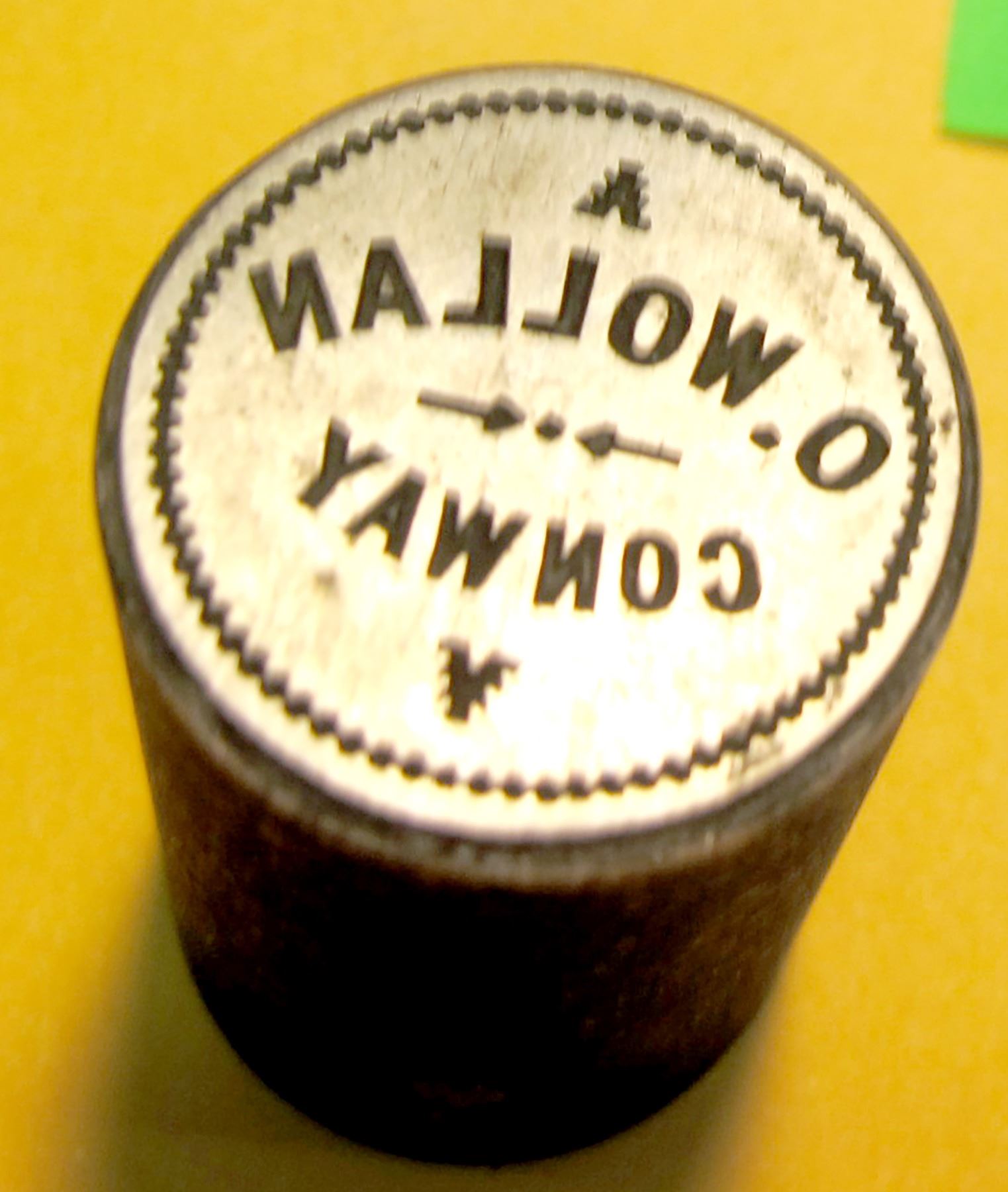 1 token die identified from Conway, WA. 24mm: O Wollan. Northwest Territorial Mint Token Die Collection.