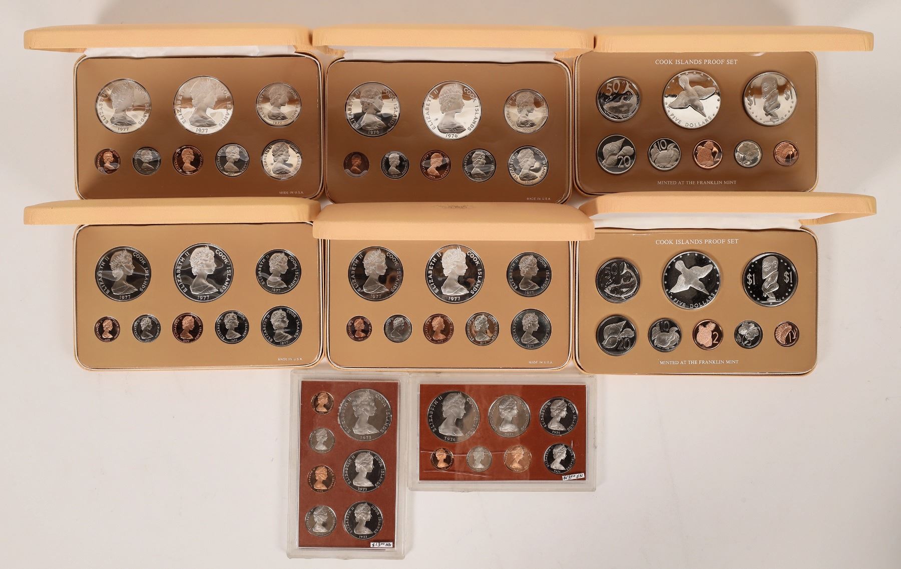 Cook Islands Proof Sets minted at the Franklin Mint: 1973 (seven coins); 1974 (seven coins); (3) 1976 eight coins; (3) 1977 eight coin sets. The first two are in hard plastic cases; the last six are in hard cover cases with certificates of authenticity.