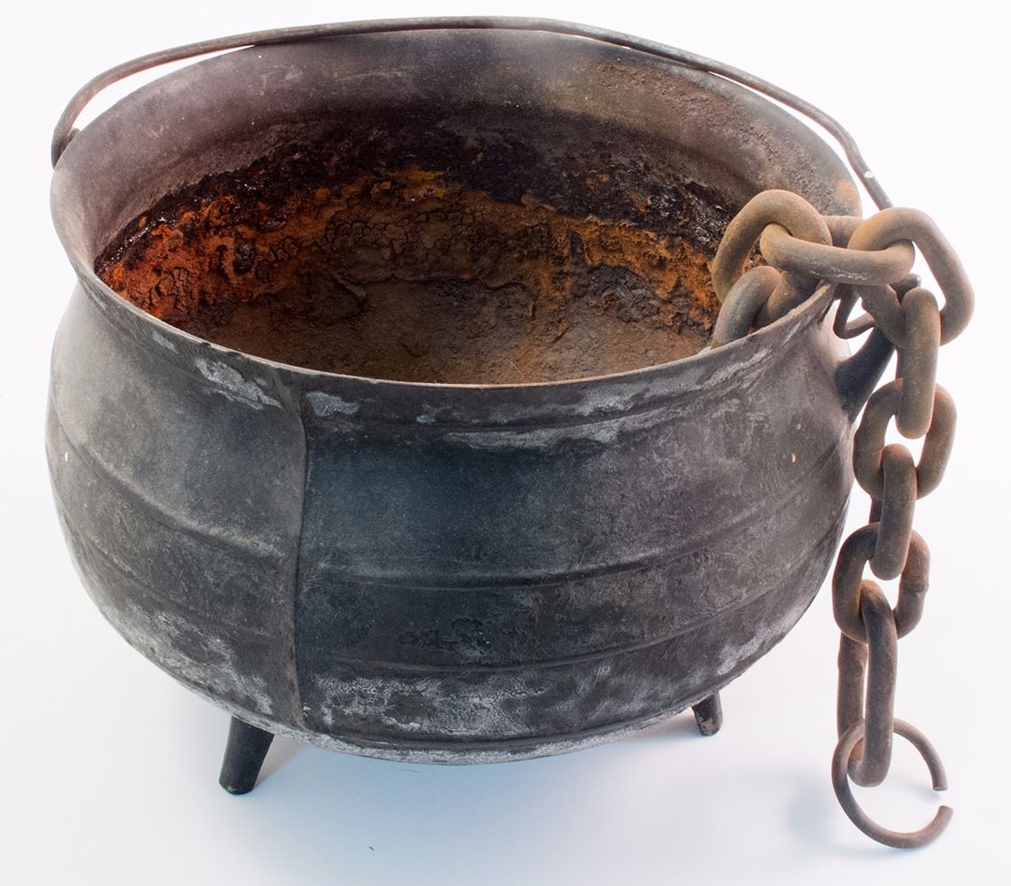 This old cook pot with a chain was found on the Emigrant Trail by Clayton Phillips in the 1950's. Cast iron, rusted inside. State: California City: Date: FHWAC#: 41672
