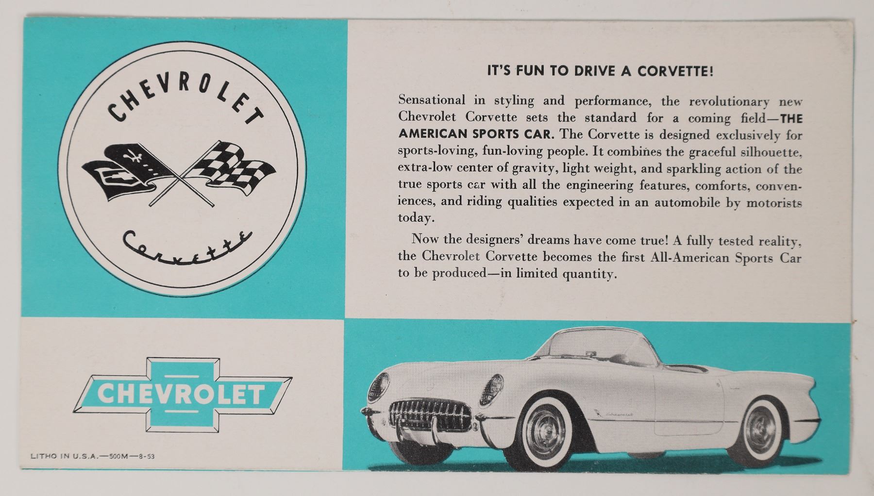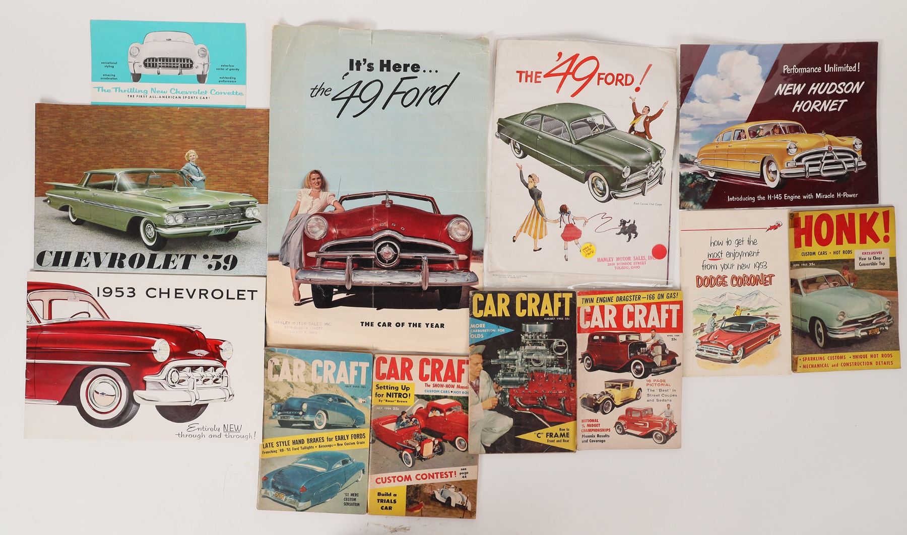 Rare 1953 Corvette 2 sided promo sheet, only 300 cars made in 1953. Hudson Hornet. 1949 Ford. 1953 and 1959 Chevrolet. 5 1950's hot rodding magazines, etc.