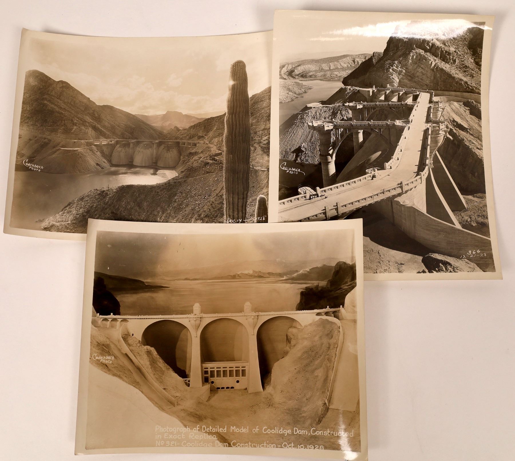 Lot of three 10 x 8 B&W photographs of the Coolidge Dam dated 1928 by Cadenbach Photo. One is a model of the dam. The Coolidge Dam is a reinforced concrete multiple dome and buttress dam 31 miles southeast of Globe, Arizona on the Gila River. Built between 1924 and 1928, the Coolidge Dam was part of the San Carlos Irrigation Project.