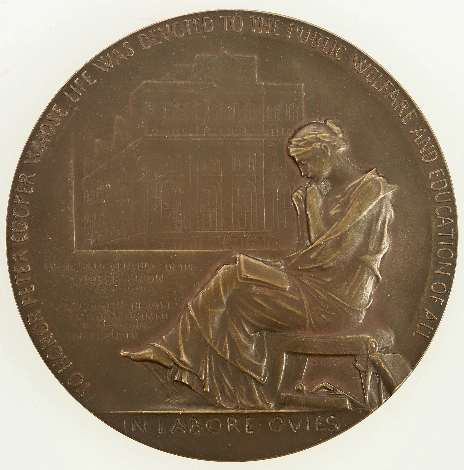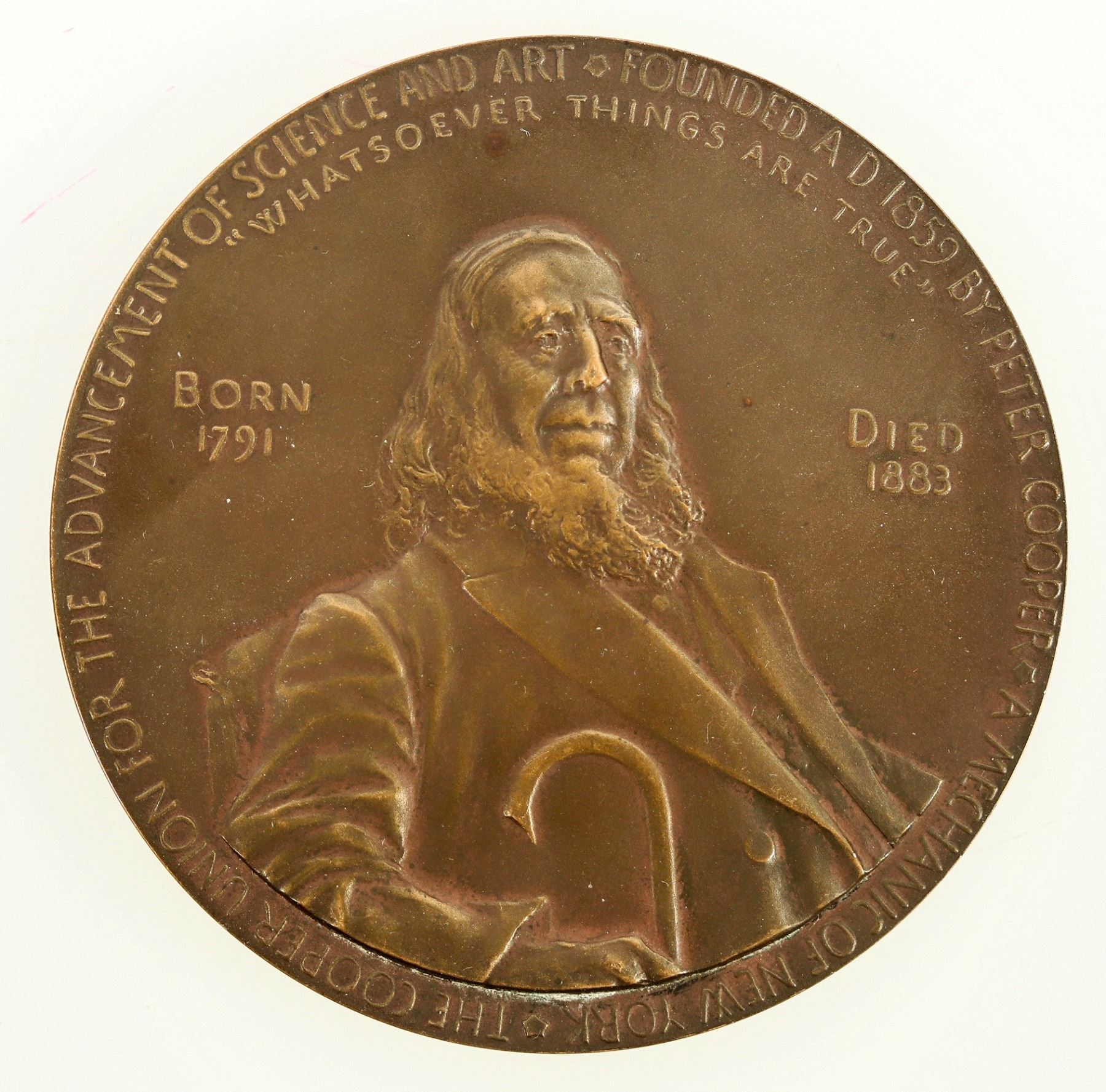 Bronze medallion commemorating the 50th anniversary of Cooper Union in New York City. Obv inside rim reads: // TO HONOR PETER COOPER WHOSE LIFE WAS DEVOTED TO THE PUBLIC WELFARE AND EDUCATION OF ALL / IN LABORE OVIES //. Center is a bas relief of a seated woman in a flowing robe reading a book with a representation of the Cooper Union building in the background. The text to the left of the woman reads: //FIRST HALF0CENTURY OF THE / COOPER UNION / 1859-1909 / SARAH AMELIA HEWITT / WITH LOVE AND REVERENCE / FOR HER FATHER / THE FOUNDER //. Rev inside rim reads: // THE COOPER UNION FOR THE ADVANCEMENT OF SCIENCE AND ART * FOUNDED A D 1859 BY PETER COOPER * A MECHANIC OF NEW YORK //. Center is a bas relief of a bearded Peter Cooper with his birth and death year on either side of his head. Edgemark reads: // TIFFANY & CO. MAKER m BRONZE / MAX J. JOSEPH //. Peter Cooper was the inventor and manufacturer of the "Tom Thumb" steam locomotive, becoming one of the wealthiest Americans of his time. He established Cooper Union and offered free tuition to all who were admitted.