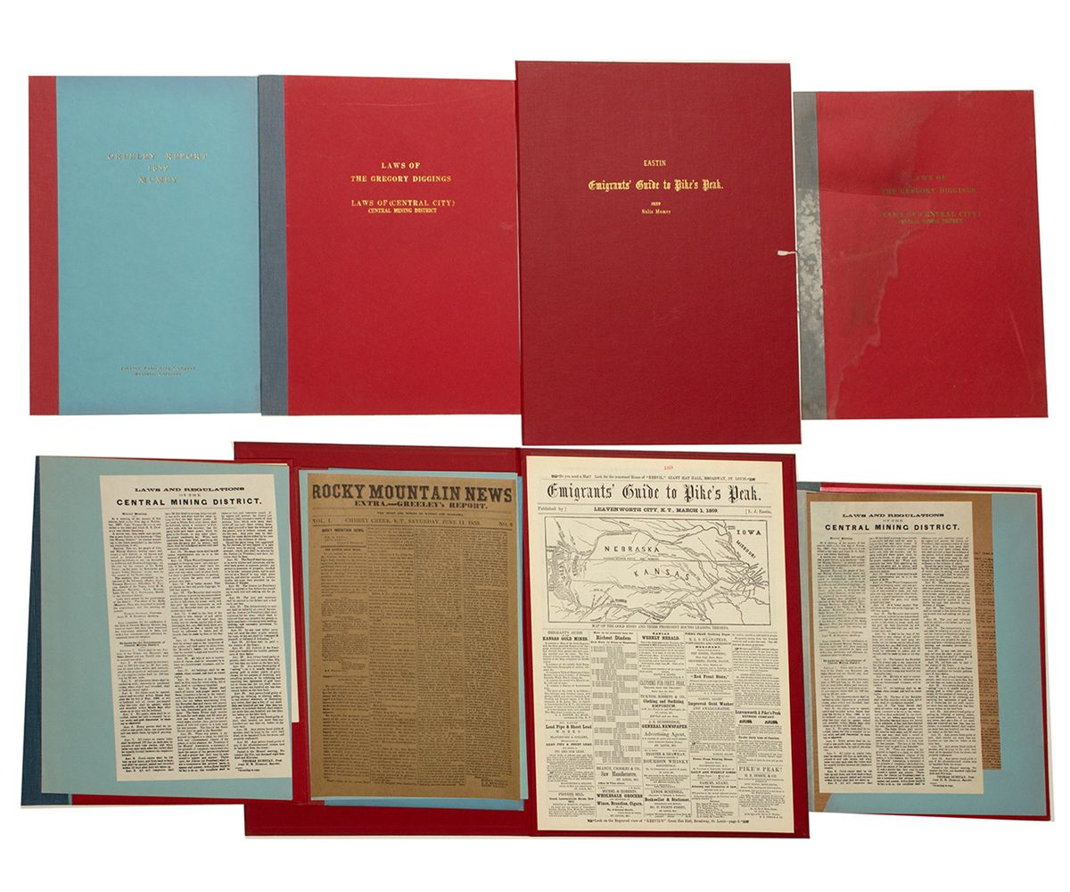 Early Colorado Reprints. Nolie Mumey reprints of four works: Greeley report, 1859 (1pp newspaper style reprint of V1#6 Rocky Mountain News, June 1859); Laws of Gregory Diggings, Laws of Central City Mining District (2 copies. one water stained); Eastin's Emigrant Guide to Pikes Peak (8/pp newspaper style guide, March 1859). All are in large folio format. See note under Mathews for notes on Nolie Mumey.City: County: State: CODate: