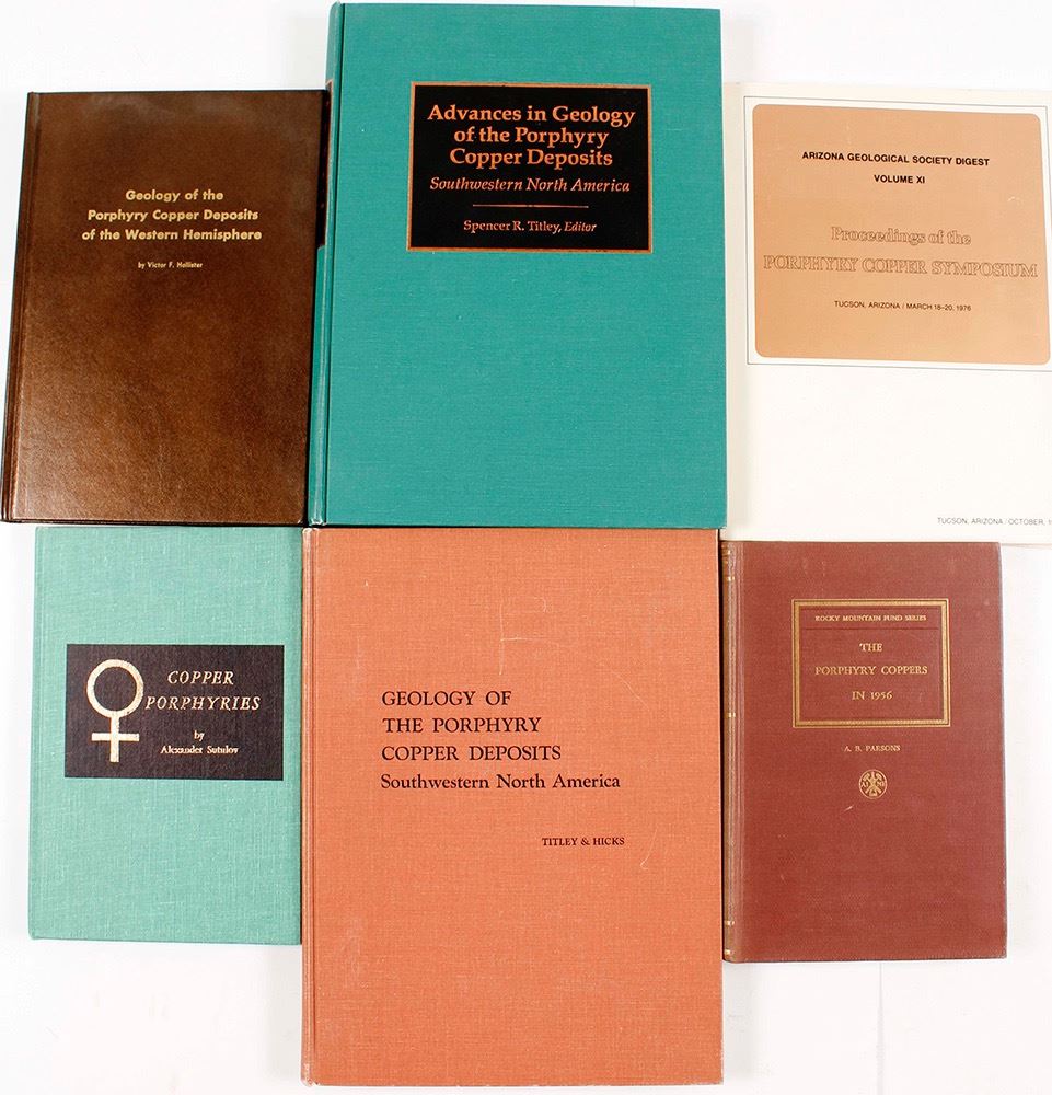 Soft cover, Proceedings of the Porphyry Copper Symposium 1976. Hardcovers- Copper Porphyry by Sutulov, Geology of the Porphyry Deposits of the Western Hemisphere by Hollister, Geology of the Porphyry Copper Deposits by Titley and Hicks, Advances in Geology of the Porphyry Copper Deposits by Titlley Date: Location: HWAC# 56558