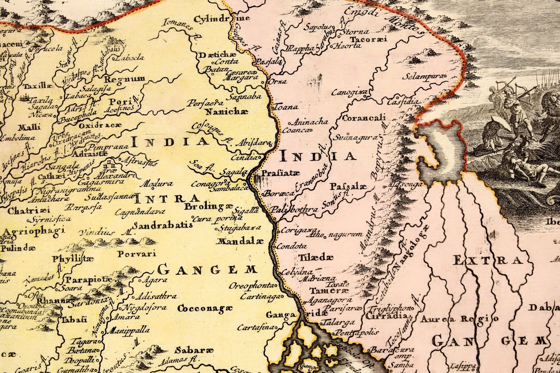 Lot of 3. Maps are all hand colored.1. Map of France, cartography, 1719, this map would have been around the rule of Julius Caesar. 2. Antique Asia, 1719. Lower left decorated with 12 historical coins. 3. India, 1720. Inside and outside the Ganges. All are in excellent condition. 14 x 17".