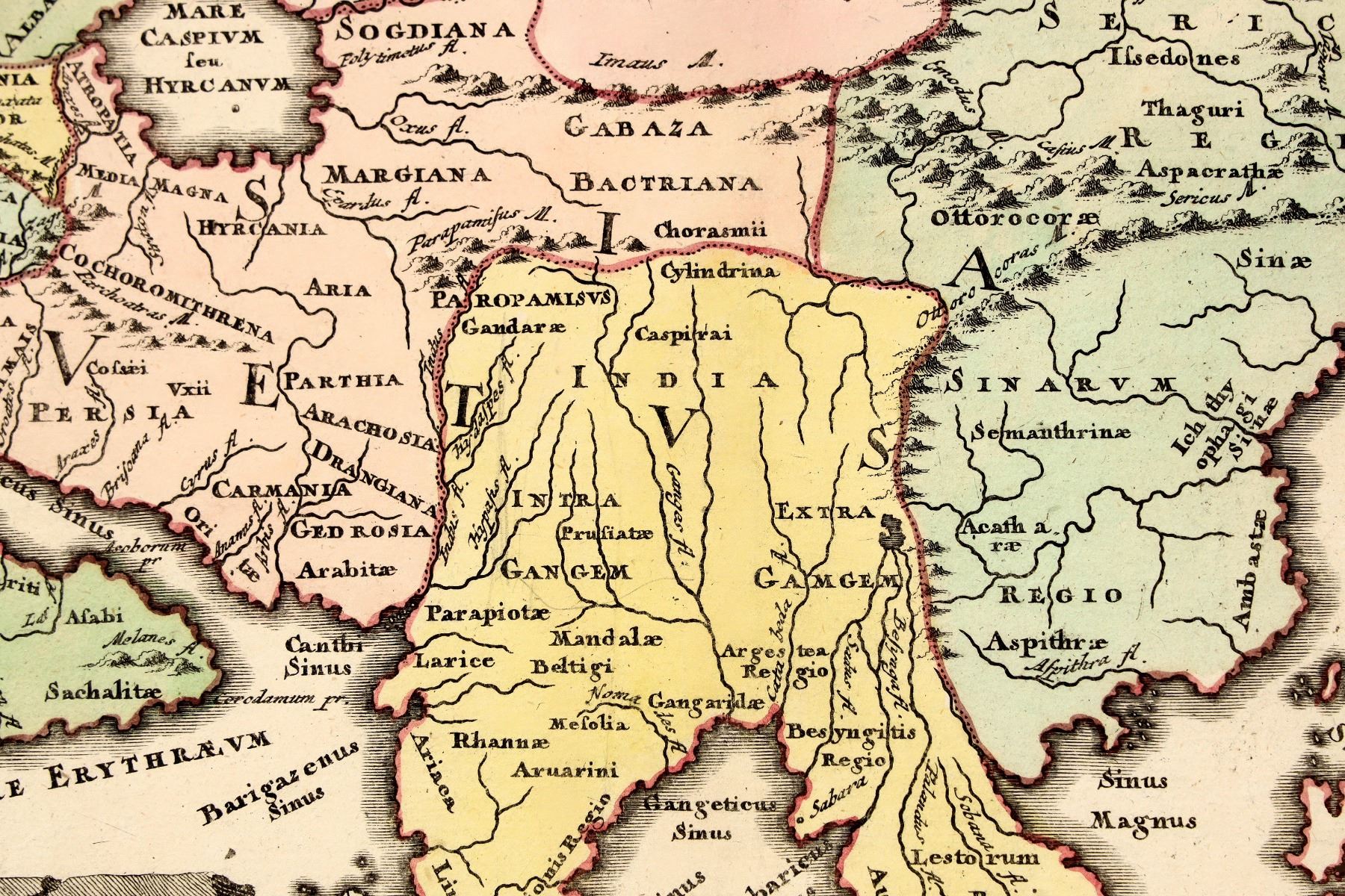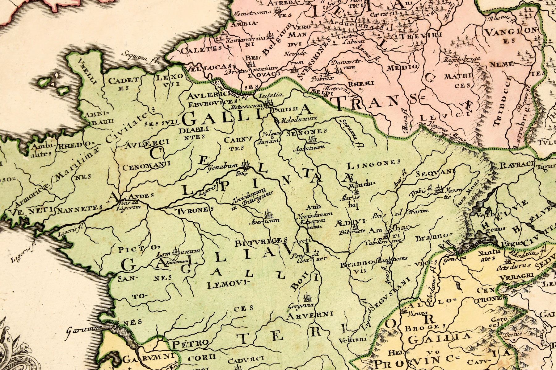 Lot of 3. Maps are all hand colored.1. Map of France, cartography, 1719, this map would have been around the rule of Julius Caesar. 2. Antique Asia, 1719. Lower left decorated with 12 historical coins. 3. India, 1720. Inside and outside the Ganges. All are in excellent condition. 14 x 17".