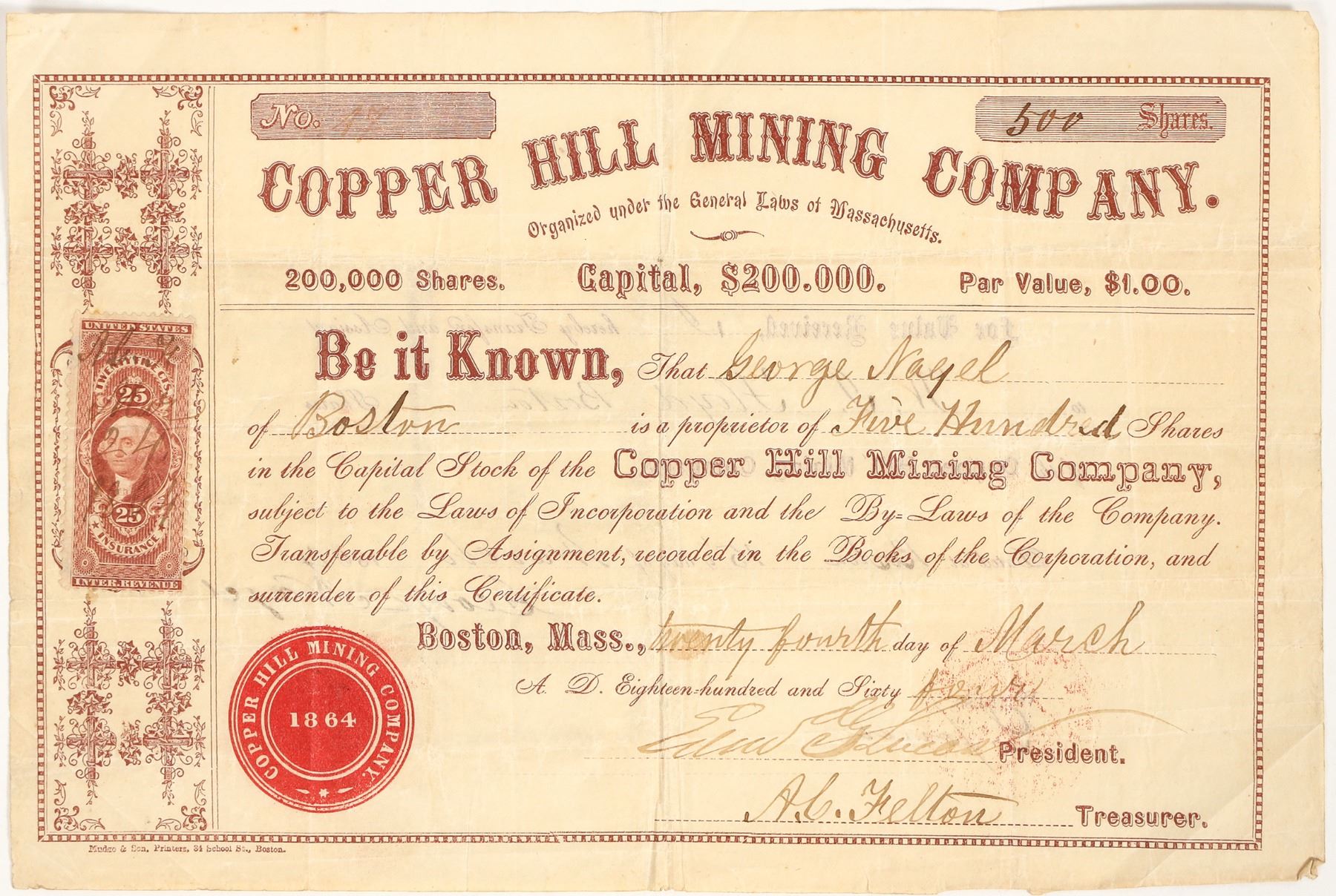 Not precisely located. At this time, there were Copper Hill Mining Companies at Campo Seco, Calaveras County, and in the Soledad Mining District, Kern County, California. Our consignor believes this company to be related to Copperhill, Tennessee. No. 17, issued for 500 shares to George Nagel in Boston in 1864. Signed by president Lucas and treasurer Felton. Folds, creases.