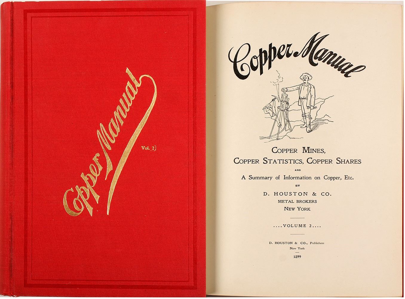 Hardback book of Copper Mines, Copper Statistics, Copper Shares / A Summary of Information on Copper Etc. By D. Houston & Co. / Metal Brokers 398 pp., page edging in gold. Slight tearing at binding of book. Good condition. 6.5" x 9.5". Date: 1899 Location: New York HWAC# 57565