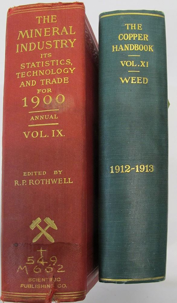Lot of 2 books. The Copper Handbook / The Copper Mining Industry of the World by Walter Harvey Weed, E.M. 1411 pp., nice condition; The Mineral Industry / Statistics, Technology and Trade, United States and Other Countries to the end of 1900. By Richard P. Rothwell. Damage to spine taped together, 985 pp. Annual Vol. IX. HWAC# 62013 Date: 1901 Location: