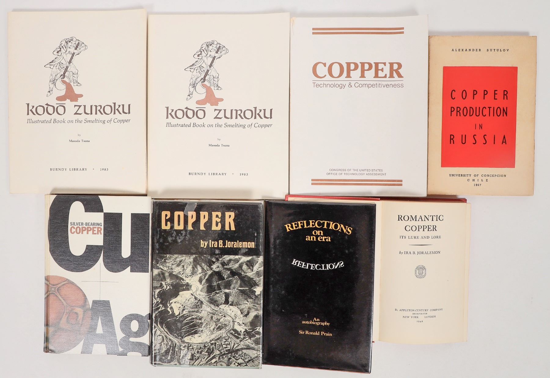 A collection of eight books on the history, science, and economics of copper mining and processing. The collection contains books on copper from around the world; the group includes two copies of a book on Japanese copper smelting, a history of Russian copper production, the autobiography of a copper magnate in Rhodesia (now Zambia), and a book on the international history of copper. In addition to historical topics, two books from the collection focus on the technical procedure and technology of copper production. All books are in good condition.