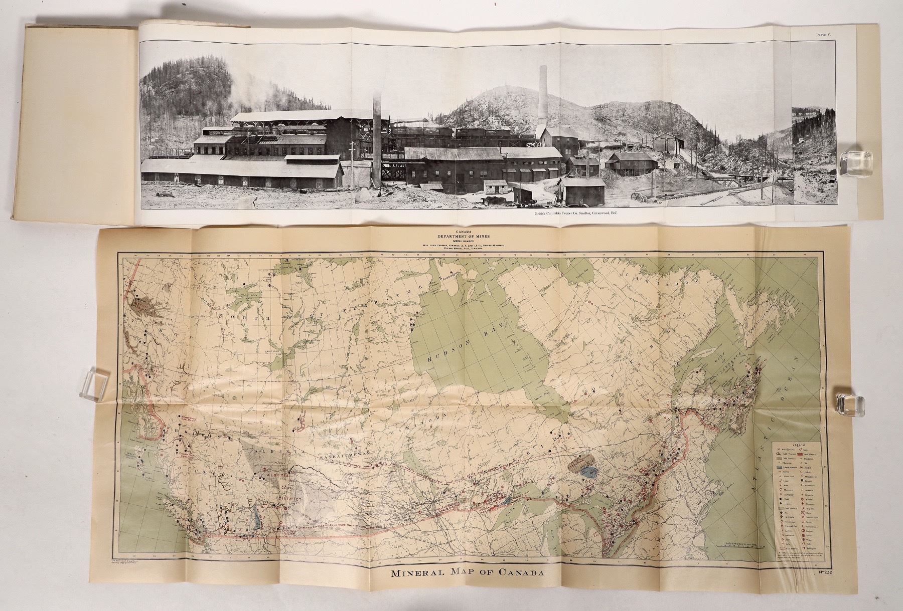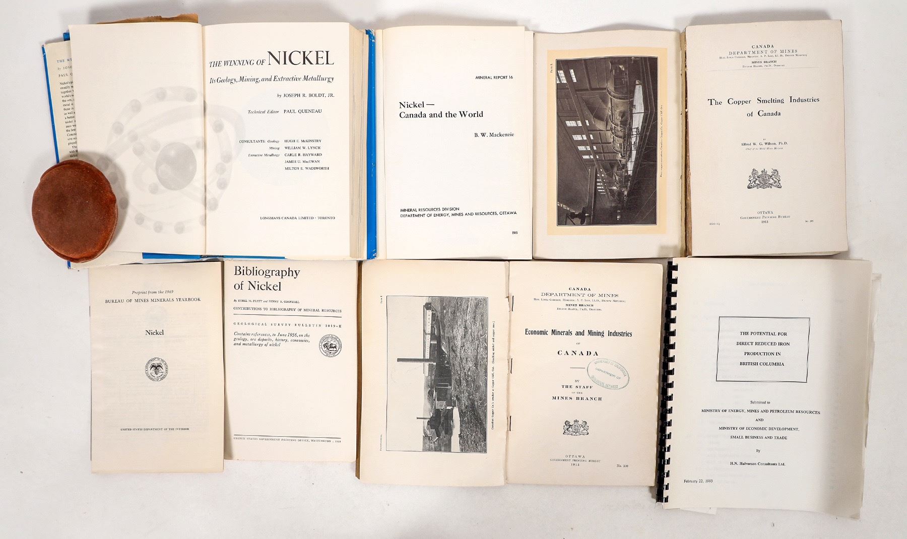 Library of 6 books about copper and nickel in Canada, c1913-93. Includes: "The Winning of Nickel," Joseph R. Boldt, Jr., 1967, hardback with dust cover, 487 pp.; "Nickel - Canada and the World," B.W. Mackenzie, 1968, Dept. of Energy, Mines and Resources, paperback with dust cover, 176 pp.; "Economic Minerals and Mining Industries of Canada," 1913, Dept. of Mines, paperback, 77 pp., map; "The Copper Smelting Industries of Canada," Alfred W.G. Wilson, PhD, 1913, Dept. of Mines, paperback, 183 pp., 4 fold-out panoramic photos, rear cover detached; etc. Please see photo(s) for more details.