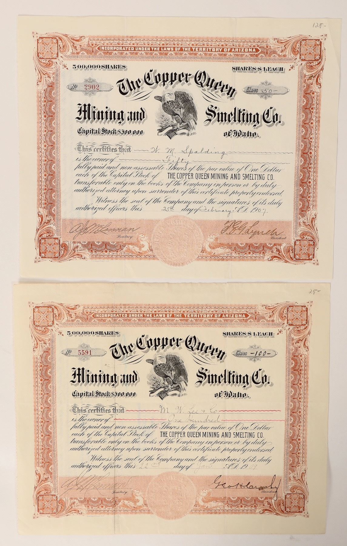 Issued 1907 and 1907 Copper Queen Mining and Smelting stock. Located in Eureka District, Lemhi county, NOT Bisbee, AZ.[ Idaho