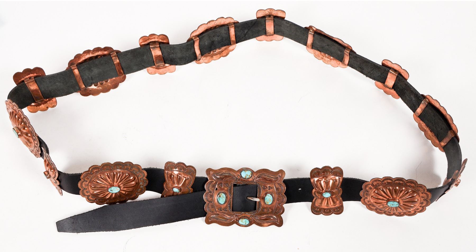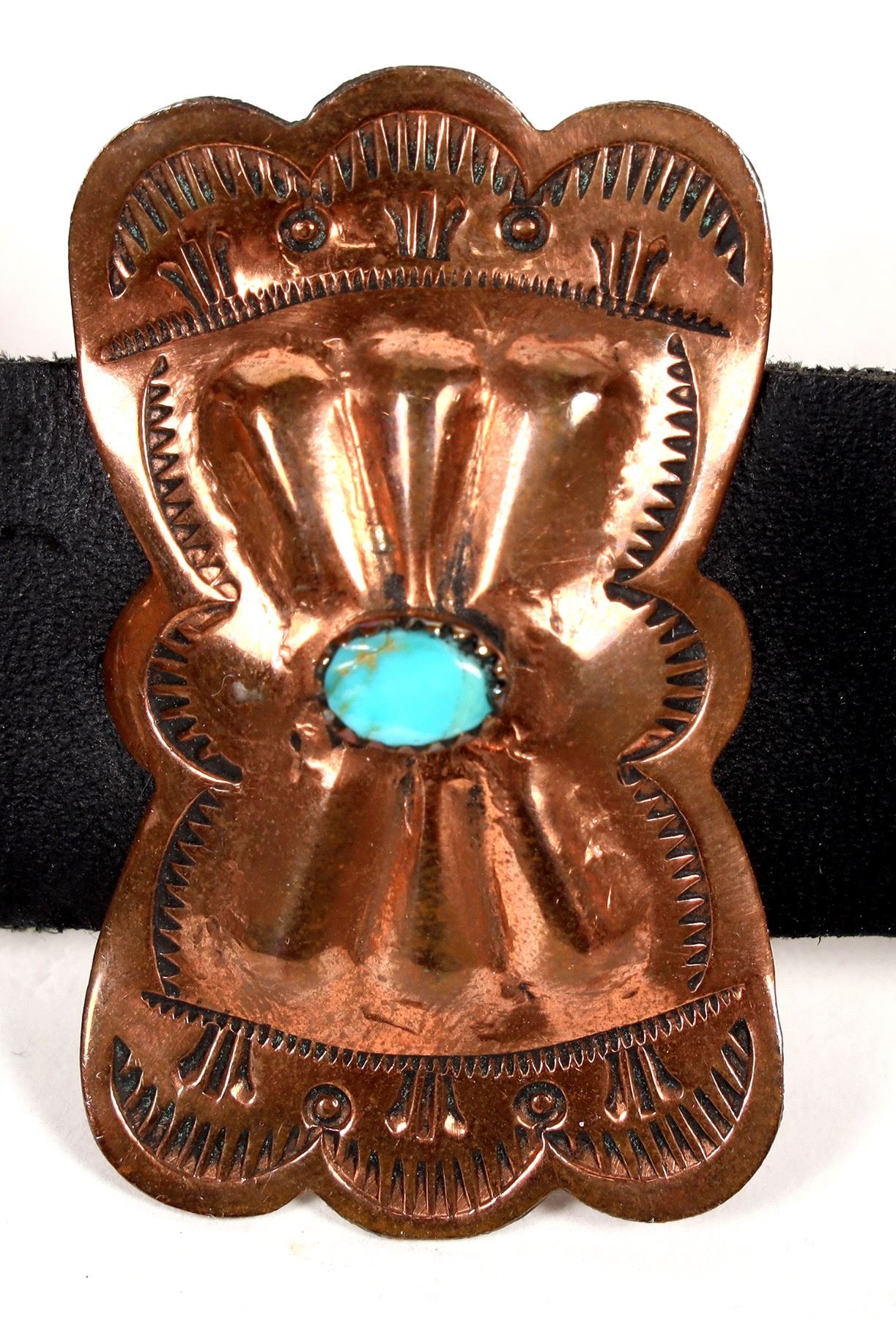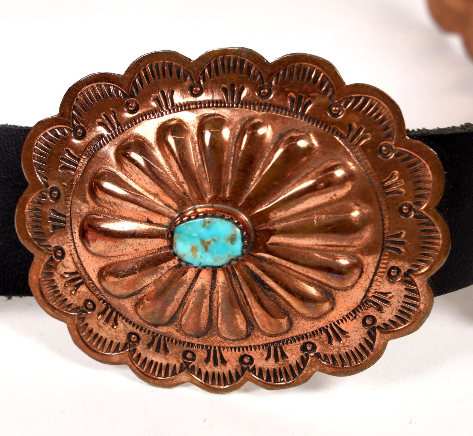 A vintage leather belt with copper plated conchos and buckle adorned with bright blue turquoise that's probably from Bisbee, Arizona. Western engraved buckle is stamped on rear with a hallmark insignia "AB" with a horse beneath it. It features four approx. 1/2" long turquoise pieces. Beautifully engraved conchos with one turquoise piece each, alternate in design across the entire length of the belt, 15 conchos in all. Buckle measures 3" x 2-1/4". Conchos are 2-1/2" x 2" and 1-1/4" x 2. Belt is 47" long by 1" wide. Unisex - could be worn by a man or woman. Dark brown soft and supple leather belt is in "like new" condition, and appears to never have been worn.