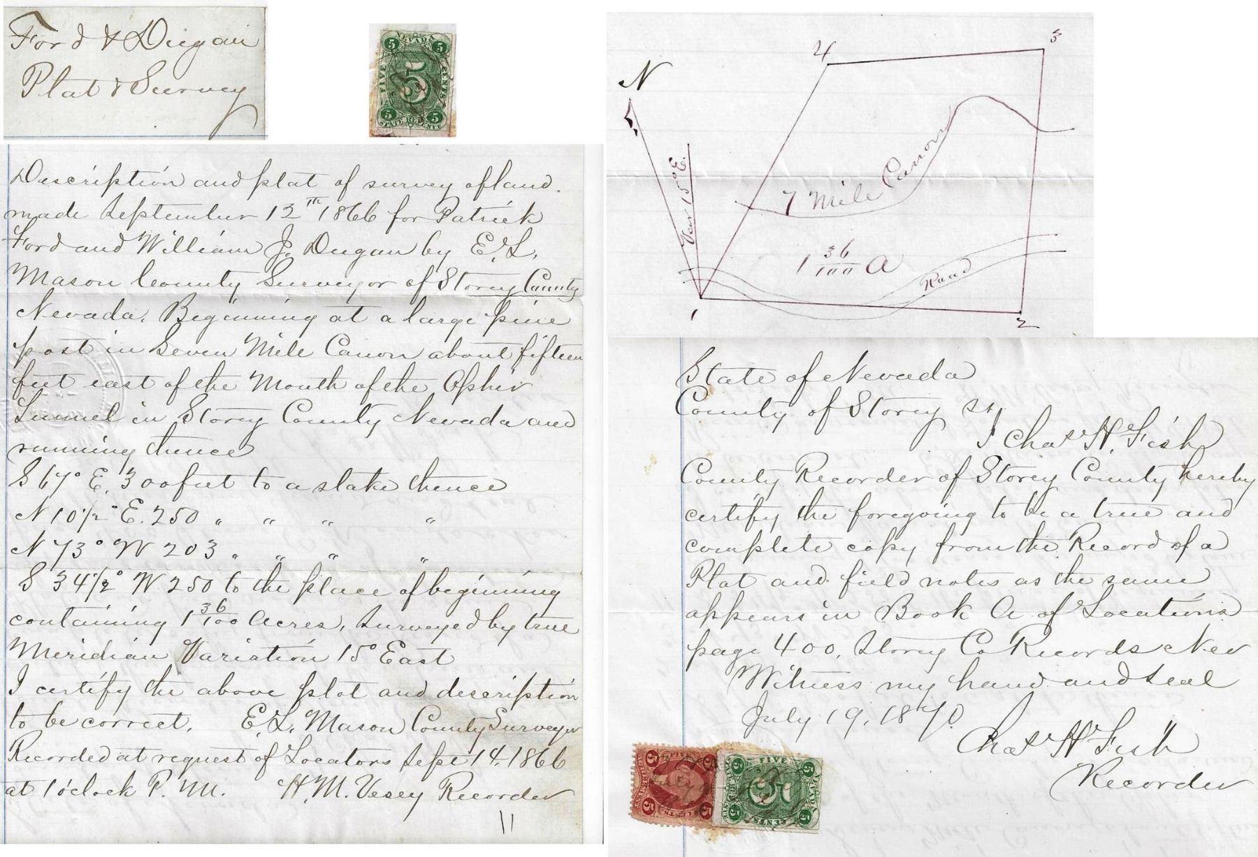 1870 copy of an 1866 document laying out the location of a claim laid out by Patrick Ford and William J Dugan. It clearly states the hand drawn map done by county surveyor EL Mason begins at, "...the large pine post in Seven Mile Canon about fifteen feet east of the Mouth of the Ophir Tunnel." The Ophir was one of the largest producers and the first real strike on the Comstock.. Background notes on the Seven Mile Canyon is included. State: Nevada City: Seven Mile Canyon, Storey Date: HWAC# 99425