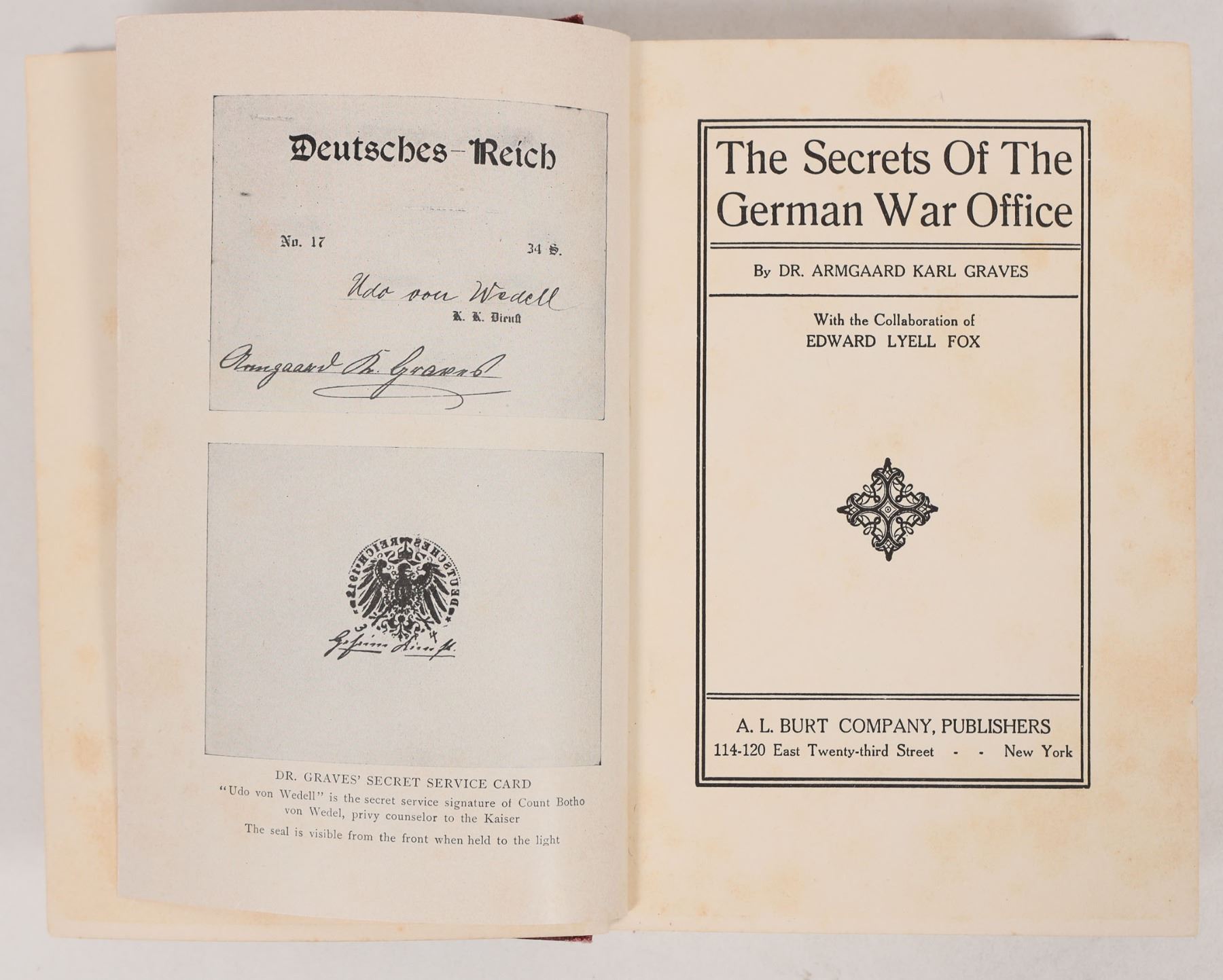 A copy of 'The Secrets of the German War Office' by Dr. Armgaard Karl Graves, an Imperial German Navy member who served as a mole for MI5 just before World War I. The book is an autobiography detailing his experiences as a secret agent, originally published to widespread success in 1914. It has some damage; while the book is intact, the spine is heavily worn, with its fabric detaching from the book's pages.