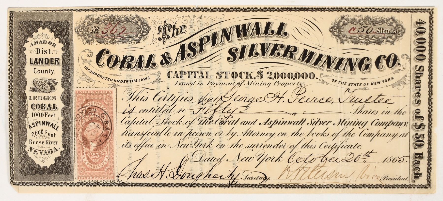Amador District, Lander County. Ledges: Coral 1,000 feet, Aspinwall 2,600 feet, Reese River, Nevada (printed in left border). Company was assuredly a consolidation of the Coral and Aspinwall mines and/or ledges. Inc. in NY. No. 362, issued for 50 shares to George Pierce in 1865. Signed by vice-president R. Peterson and secretary Chas. Dougherty. Not cancelled. Fancy black border and title. No vignette. Printer covered by 25 cent adhesive revenue stamp, pen cancelled. 4 x 8.75" Folds, some staining. Not in Filer. According to American Mining Gazette and Geological Magazine, Volume 2, Issue 1, (1865), "Professor Silliman expresses a favorable opinion of its resources." The Amador Mining District was 6 miles north of Austin around New York Canyon and later incorporated into the Reese River district. [Ref: Mining Districts of Nevada, Tingley]