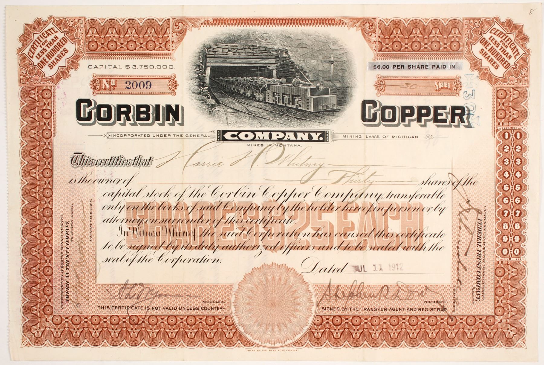 I/U #2009 Carrie Whitney 30 shares 1912. Nice motorized ore carts vignette exiting mine. Creases. . Ken Prag Collection