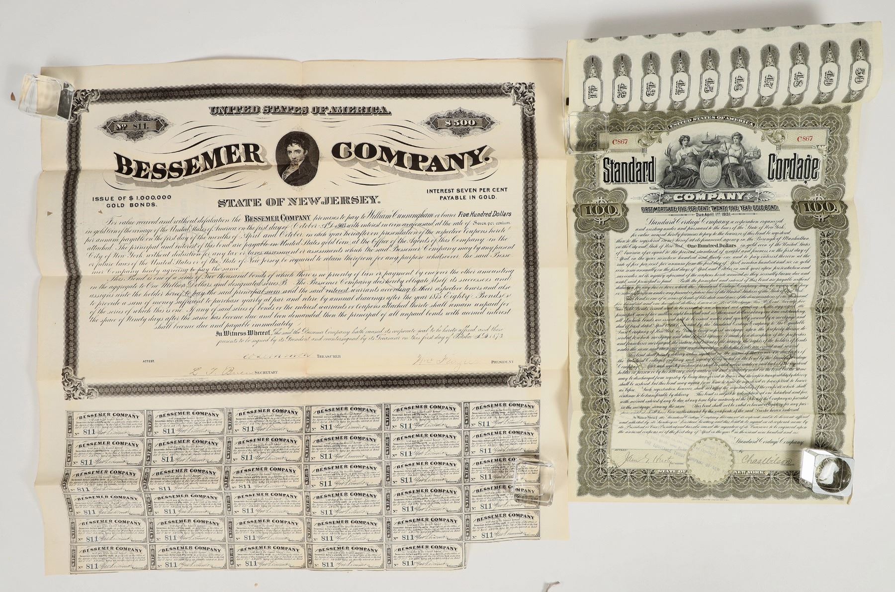 Lot of 2 different. 1) Bessemer Company of New Jersey. $500 bond issued in 1873. Not cancelled. 19 x 19" Folds, toning, some separation along folds. 2) Standard Cordage Company. New York. $100 bond issued in 1906. Pencil cancelled.