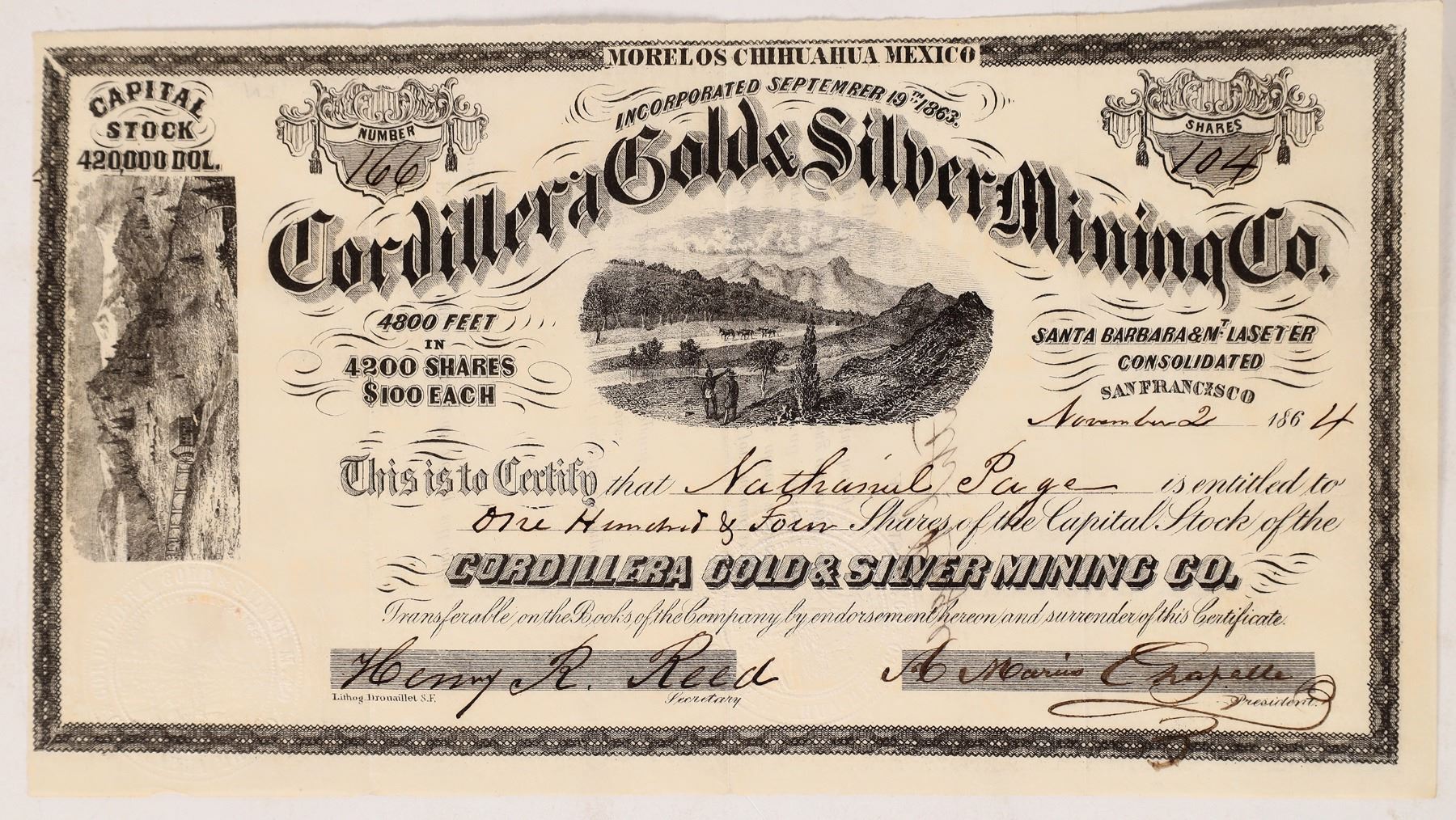 Spectacular, I/U #166 to Nathaniel Page 104 shares, 1864. Unique and interesting vignettes. Lower left chip. According to Daily Alta California, Volume 16, Number 5140, 29 March 1864: "Several workings of the ore from the Santa Barbara Mine, Morelas Mining District, Chihuahua, Mexico, produced by S. F. Clousens' amalgamating process. Wheeler's pans, gives $1,100 to the ton in silver and gold. Second and third quality ore, from the same mine, worked at Wheeler A Thayer's mill, North Beach, produced $476.92 to the ton. This ledge has been purchased by the Cordillera Gold and Silver Mining Company, of this city, for the sum of $19,000. The ledge is seven feet wide, and well defined, from which the sample ore was taken giving this result. A mill is now being built at the Miners' Foundry for this Company, which will be shipped soon, and will be in operation, it is erected, before the rainy season commences." Signed by A Marius Chapelle. This venture was San Francisco financed.