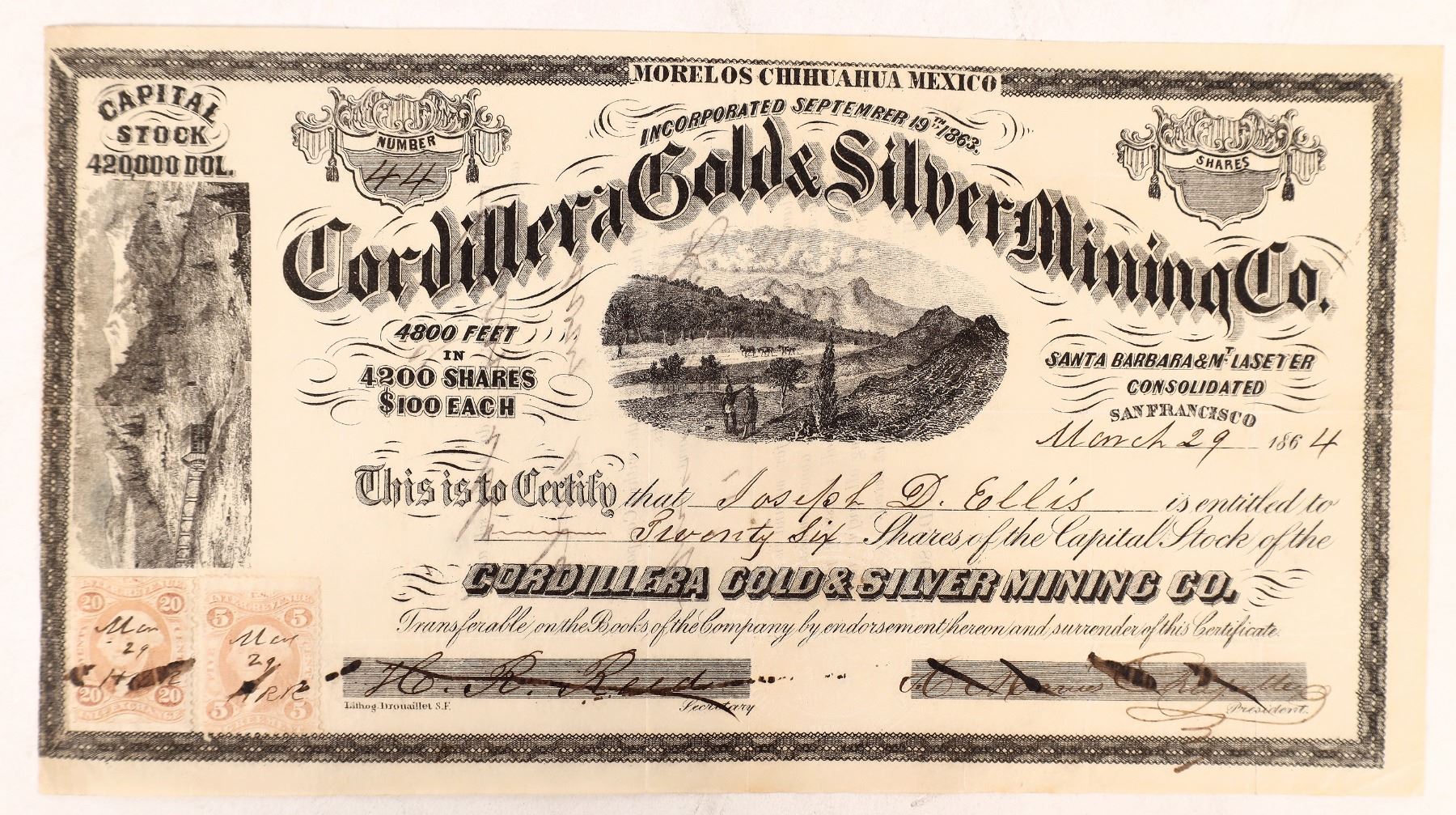 "Morelos Chihuahua Mexico" printed at top center. The mines of the company are printed above the San Francisco dateline: "Santa Barbara & Mt. Laseter Consolidated." Inc. Sept. 1863. No. 161, issued for 26 shares March 29, 1864 to Joseph D. Ellis Signed by the president (illegible) and secretary Henry R. Reed, cancelled by lining out signatures. Black border and print, vignette of Mexican countryside (top center) and mining scene (left border). Lith. Drouaillet, SF. 20 cent and 5 cent adhesive revenue stamps at bottom left. Three pin holes in word "Gold",cut tight from stock book on left. Embossed corporation stamp bottom center. EF cond. Mexico Ken Prag Collection