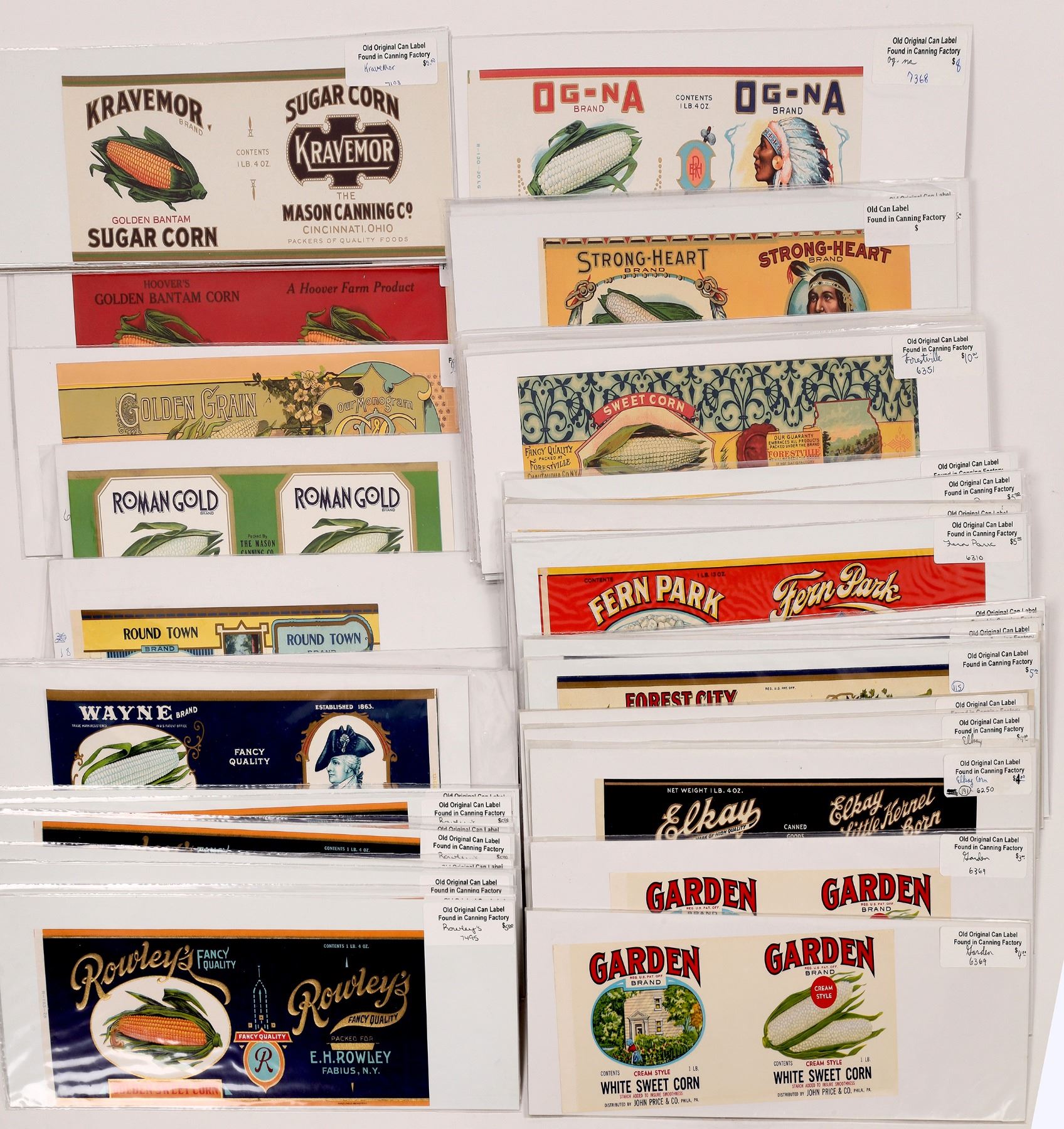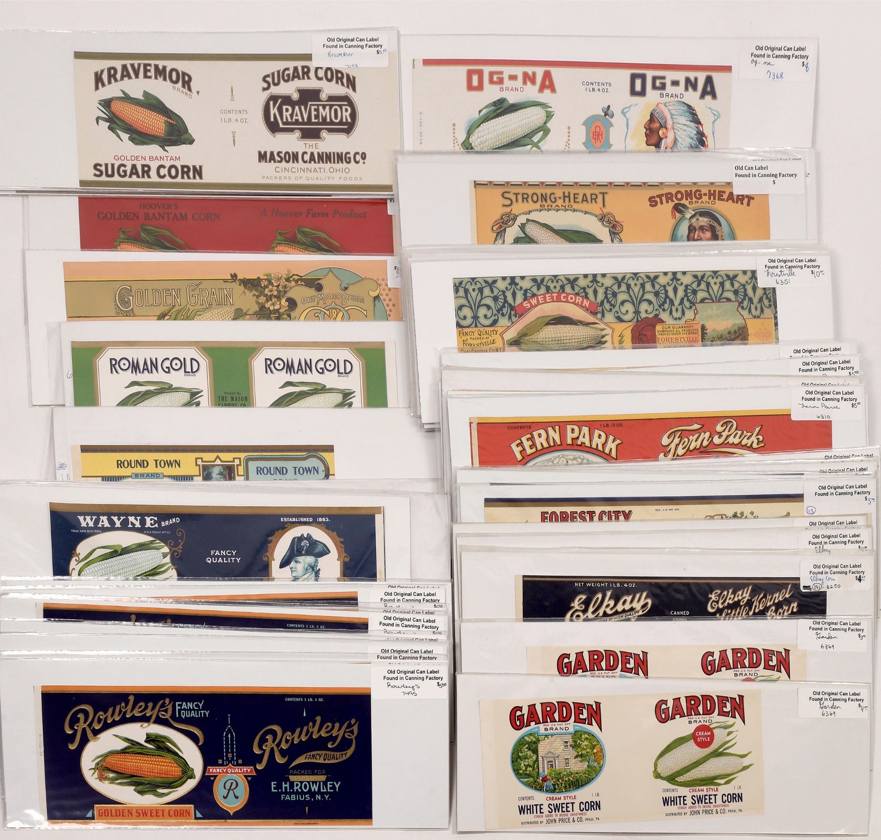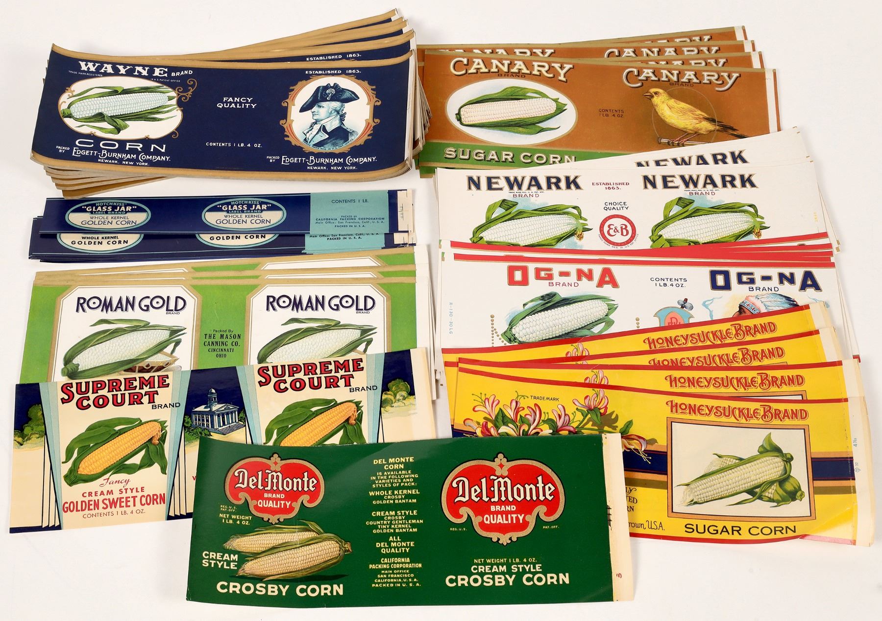 About 400 corn can labels. Wayne, Strong Hear Rowley's, Supreme Court, Newark, Canary, Fern Park, hominy and more.