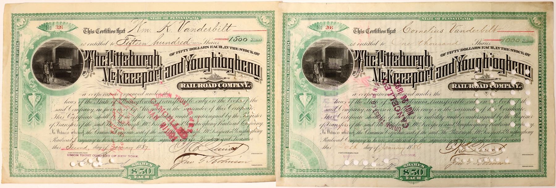 Lot of two. 1) # 266 issued to C. Vanderbilt for 1000 shares.. Signed by him on reverse. Cornelius Vanderbilt was a Philanthropist, Railroad Financier, Son of William H. Vanderbilt and Grandson of Commodore Cornelius Vanderbilt. 2) # 326 for 1500 shares issued to Wm. K. Vanderbilt in 1887. Signed by W Vanderbilt on reverse. William Kissam Vanderbilt was an American heir, businessman, philanthropist and horse breeder. Born into the Vanderbilt family, he managed his family railroad investments. Both are cancelled. Underground railroad coal car vignette. Both show aging: corner folds, light discoloration.