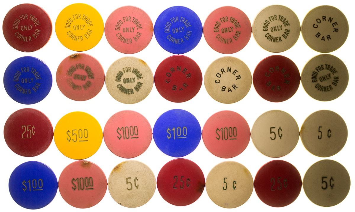 14 chips from the Corner Bar at Deer Lodge Montana. Only two of the chips are listed in the Chip Guide, none in Rubick. City: Deer Lodge State: Montana, Date: Inventory# 41302