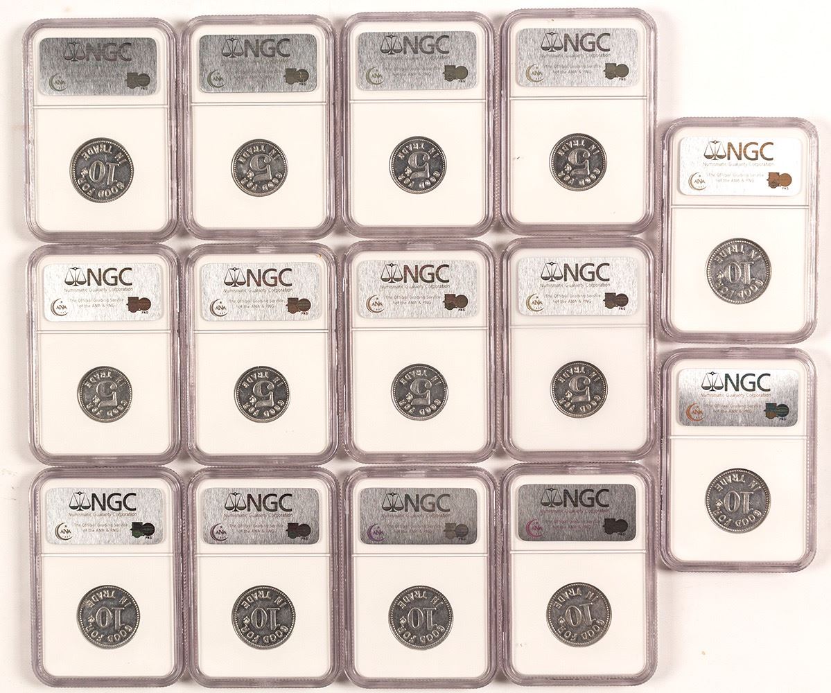 All MS 60, 61 or 62. 7 GF 5c, 7 GF 10c Date: c. 1910 Location: Kemmerer City, Wyoming HWAC# 53336