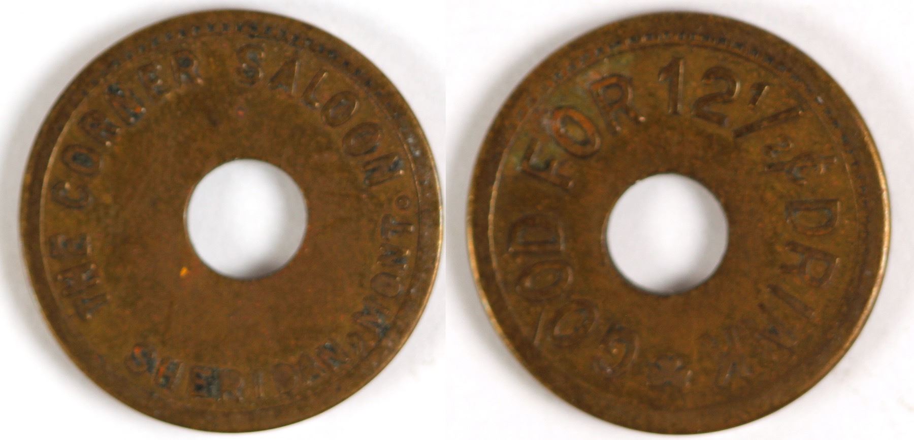 Obv.: The Corner Saloon / Sheridan, Mont.; Rev.: Good For 12 1/2c Drink. Br., rd., 21 mm. Daniel Manasselian Collection. State: Montana City: Sheridan Date: ID# 78204