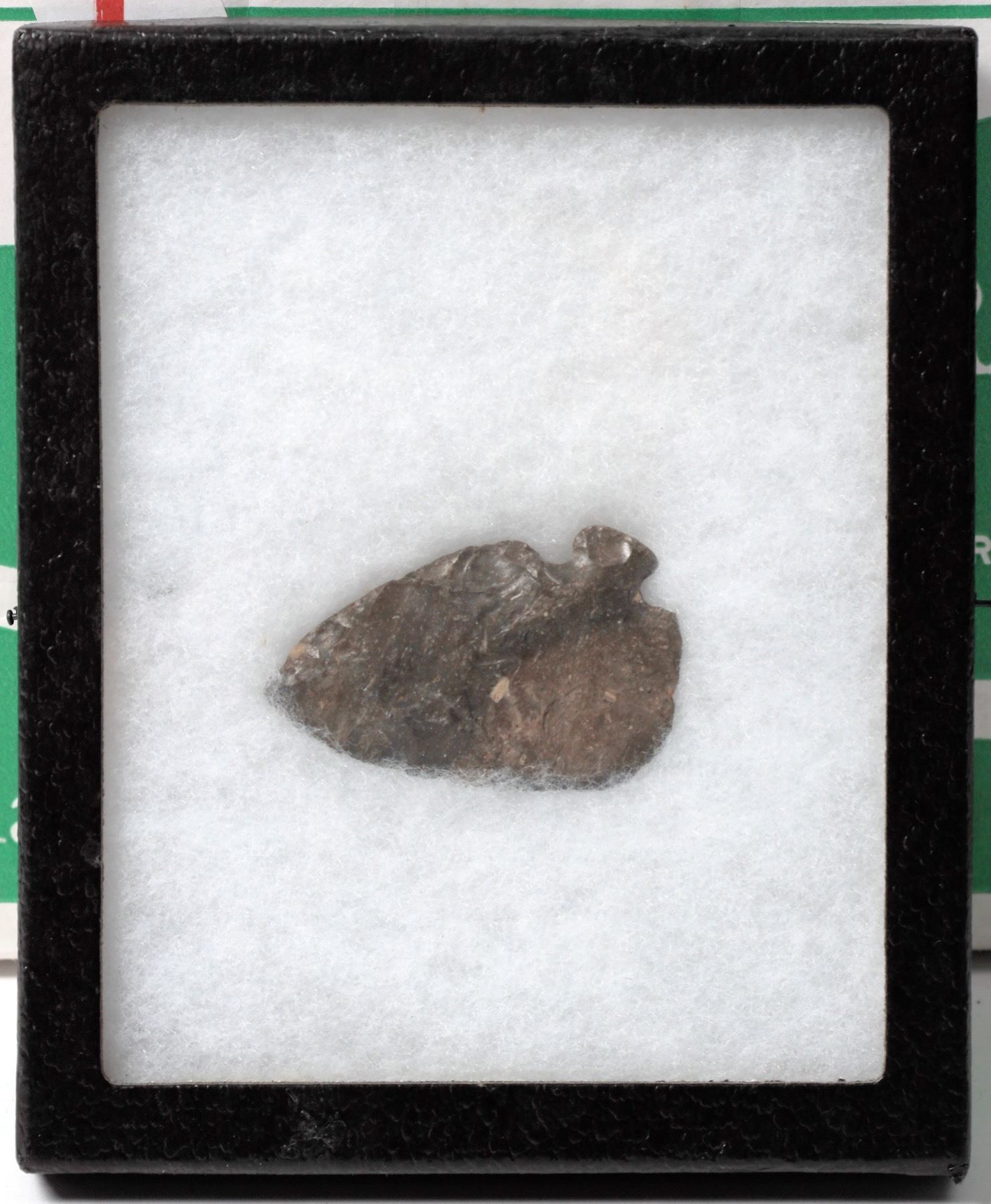 This corner tang knife was found on the Arkansas River in Pawnee County, Oklahoma. It is 2.25 in./ 57 mm. A brief explanation accompanies the knife in the Riker box. An extremely rare find. From the Gary Bracken collection. Please see photos for details.