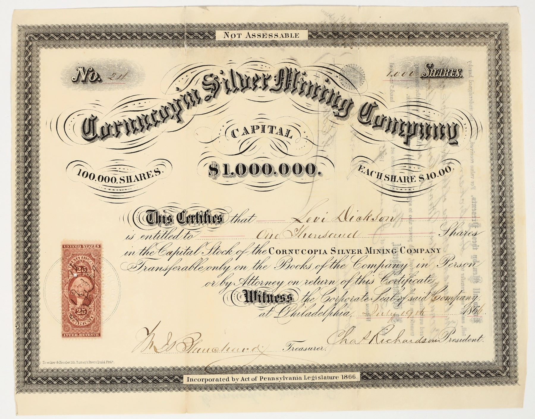 We sold one of these out of the Prag Collection, and that one had been identified on the cert. (in pencil) as Colorado Territory. However, we cannot verify this attribution. Cornucopia mines in Colorado don't spring up until the 1880s. This company is not listed in Hollister. Newspaper articles from this time period (1860s) only point to a company with this name operating out of Mono County, California. Inc. in Pennsylvania, 1866. No. 24, issued for 1000 shares to Levi Dickson in July 1866 in Philadelphia. Signed by president Chas. Richardson and treasurer Blanchard. Not cancelled. Black border and print. 25 cent adhesive revenue stamp. 8.5 x 10.5" Folds. There is reference to this company on July 17, 1867 in the Daily Evening Herald, Stockton, California: "C. C. Bruckman today received from Cornucopia Silver Mining Company, Mono county, 4,469 pounds silver matte, valued at $5.000." In 1866, the Sacramento Daily Union reported on the mines of Mono County and mention the Cornucopia. Very rare. In the 1860s, the gold deposits at Bodie had been discovered, but that camp wouldn't take off until the 1870s.