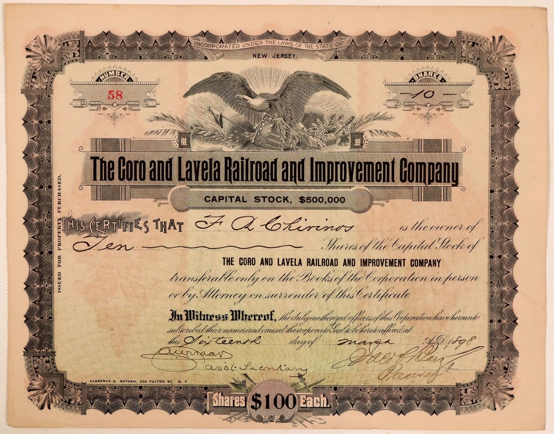 Very rare certificate from this railroad. Nothing from this company is listed in Cox. Issued for 10 shares to F.A. Chiminos and signed by Jacob Baiz as president in 1898. Eagle with flag vignette. This was a railroad line in Venezuela and the properties were seized by the Venezuelan government. The government was to subsidize the building of the railroad, but that didn't happen. Much litigation ensued. The certificate was issued for property purchased.