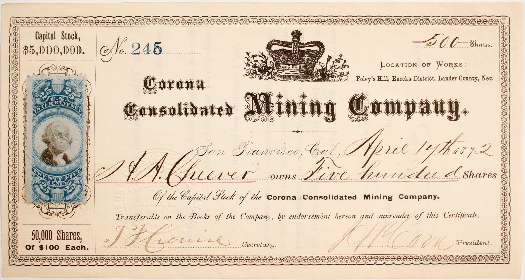 Incorporated April 3, 1872. Cert. # 245 for 500 shares of common stock @ $100 per share, issued April 14, 1872 to H.A. Chiever, signed by president signature illegible. Small horizontal format, black border, vignette of a crown with leaves on either side, 25 cent inter revenue stamp on left side. Unknown printer. Very good condition, no fold indications, tears. In protective plastic sleeve. State: Nevada City: Foley's Hill, Eureka Dist. Lander County Date: HWAC# 84604