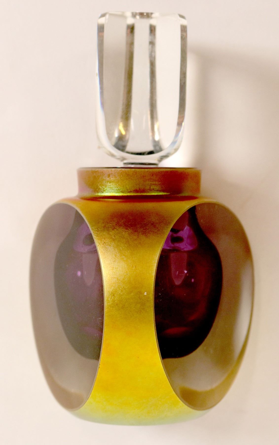 Gorgeous Correia Art Glass 1987 Limited Edition, Signed Perfume Bottle. No. 30 of an edition of 230. Striking triangular 3 panel clear bottle with Aurene gold shoulders and a dark amethyst center with a clear triangular stopper/dauber. The flat clear panels reveal the lovely deep purple interior bowl. It is signed on the bottom: "Correia / 1987 L E PBELTGLP 30/230" Approximately 2.75" tall, 4.25" tall with dauber in and 2.75" wide. Total dauber length is 3". Correia Art Glass is of the highest quality and most elegant design combinining the visual aesthetic of color, form and tactile sensation. Skilled artisans in Santa Monica, California use the freehand blowing techniques on fine sand from the American Southwest resulting in an entirely handmade process using specialized formulas of minerals and precious metals. Designs are garnet-etched into the surface of the glass, never painted on. Each unique piece is then signed, dated and registered for authenticity. Many world-famous museums display Correia Art Glass; It is in the permanent collections of the Metropolitan Museum of Art, the Smithsonian Institution, the Corning Museum and the Chrysler Museum of Art. Each year Correia Art Glass also receives commissions for special pieces from corporations and public institutions and is included in the White House art holdings.