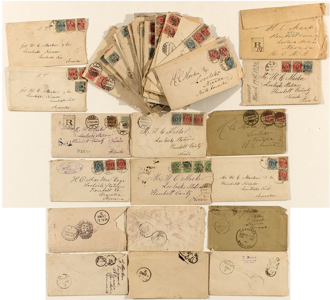This is the foreign correspondence related to the H.N. Marker collection. 38 pieces. All mailed from Denmark and to Lovelocks Station (Lovelock), 'Americka'. Unique use of 'Lovelocks Station.' Written in Danish. Various stamp and address configurations. Please see Lot 4496 for the larger H.N. Marker Collection.