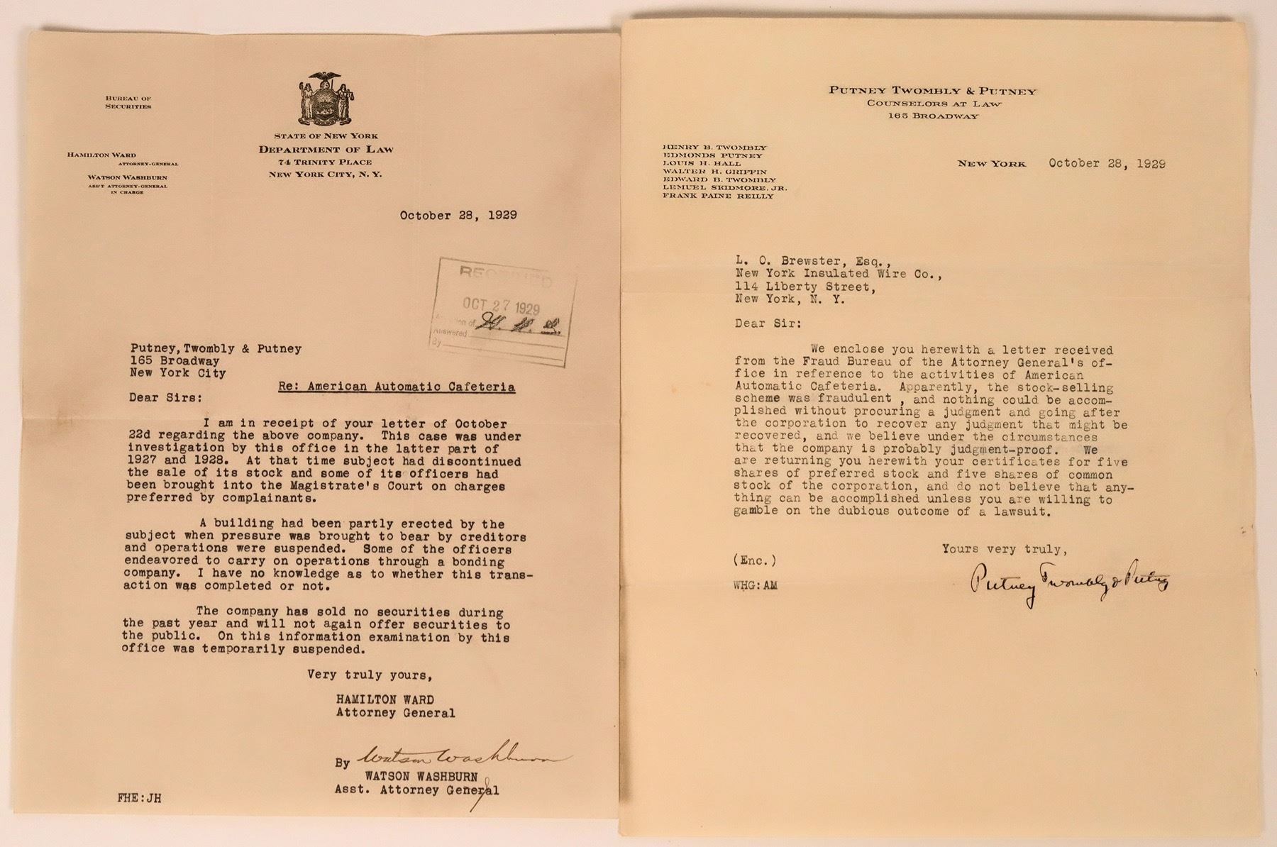 Lot of 2. One is from the State of New York Department of Law and the other is a law firm in New York. Both are related to inquiries about the American Automatic Cafeteria Company. "Apparently, the stock-selling scheme was fraudulent..." The law firm says they are returning LO Brewster's stocks and "do not believe that anything can be accomplished unless you are willing to gamble on the dubious outcome of a lawsuit."