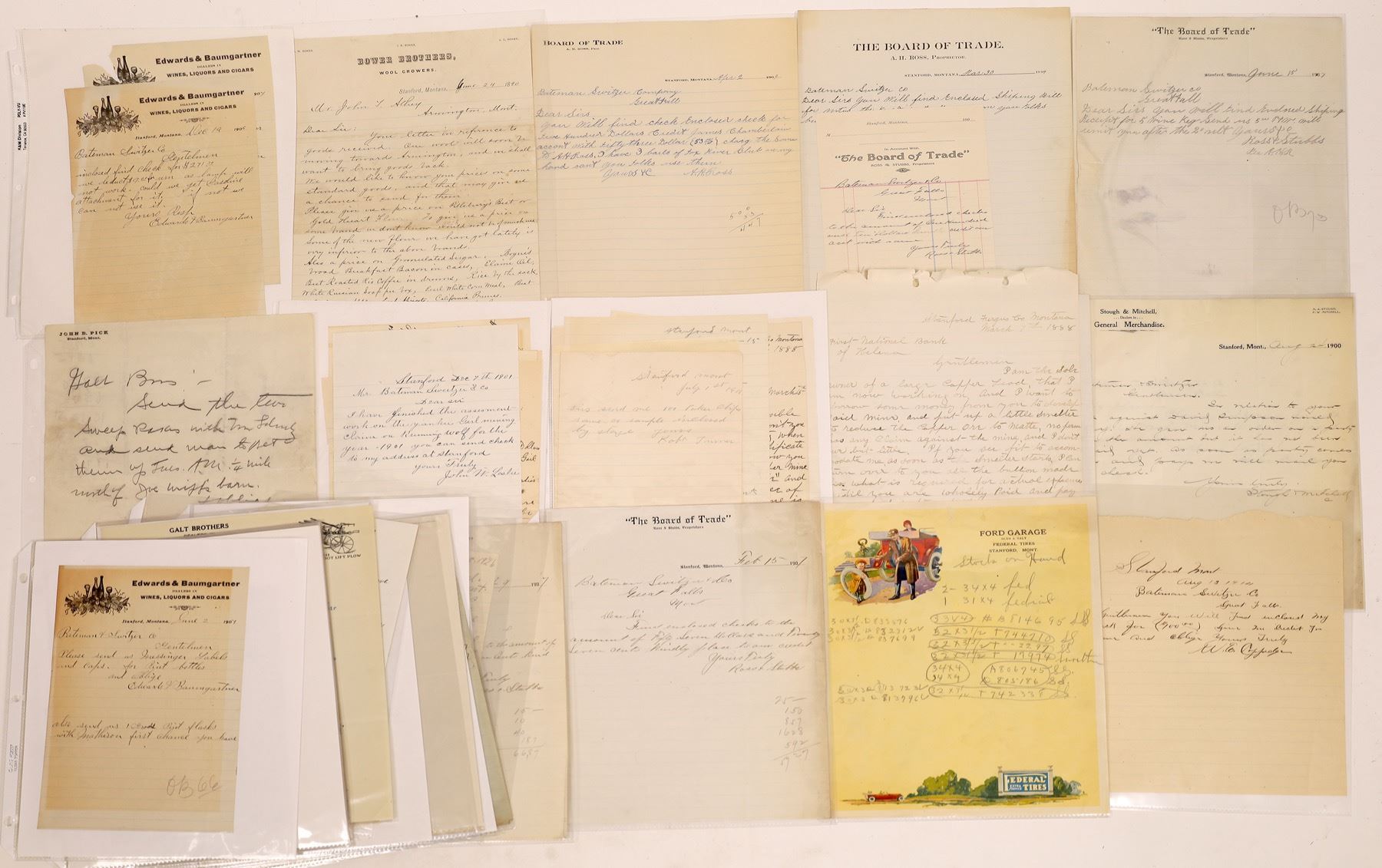 A group of about 42 items of printed letterheads and billheads with some personal correspondence, all from or related to Stanford, a small town in Judith Basin County, Montana, and named by shepherds Calvin and Edward Bower after their hometown of Stanfordville, New York. When the railroad came through in 1908, the town was relocated 3 miles to be near it. About 400 people live there now. This is an area frequented by Western artist Charles M. Russell. State:Montana City:Stanford Date: Provenance: Stuart Mackenzie Montana Ephemera Collection