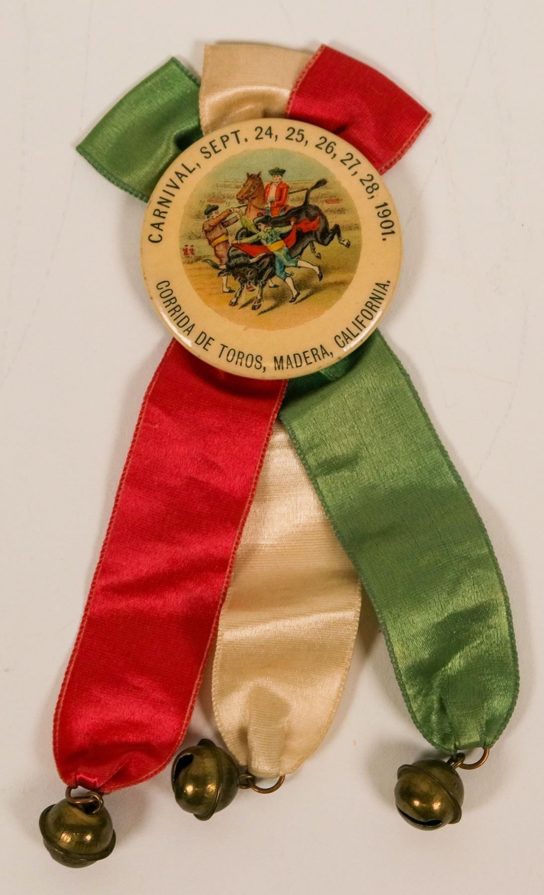 A beautiful pin back ribbon with jingle bells, celebrating a Mexican festival of the bulls in Madera during September, 1901. Very festive and in good condition.