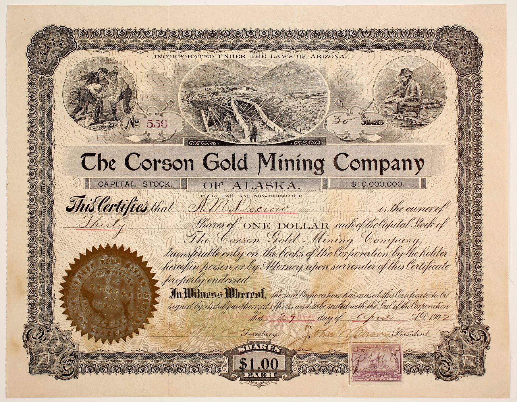 Thirty shares of Corson Gold Mining Company stock, number 556 issued to A. M. Decrow, dated April 29, 1902. Incorporated under the laws of Arizona. Three mining vignettes one where miners are working with sluice. Black border. Silver coupon and revenue stamp. Ken . Ken Prag Collection