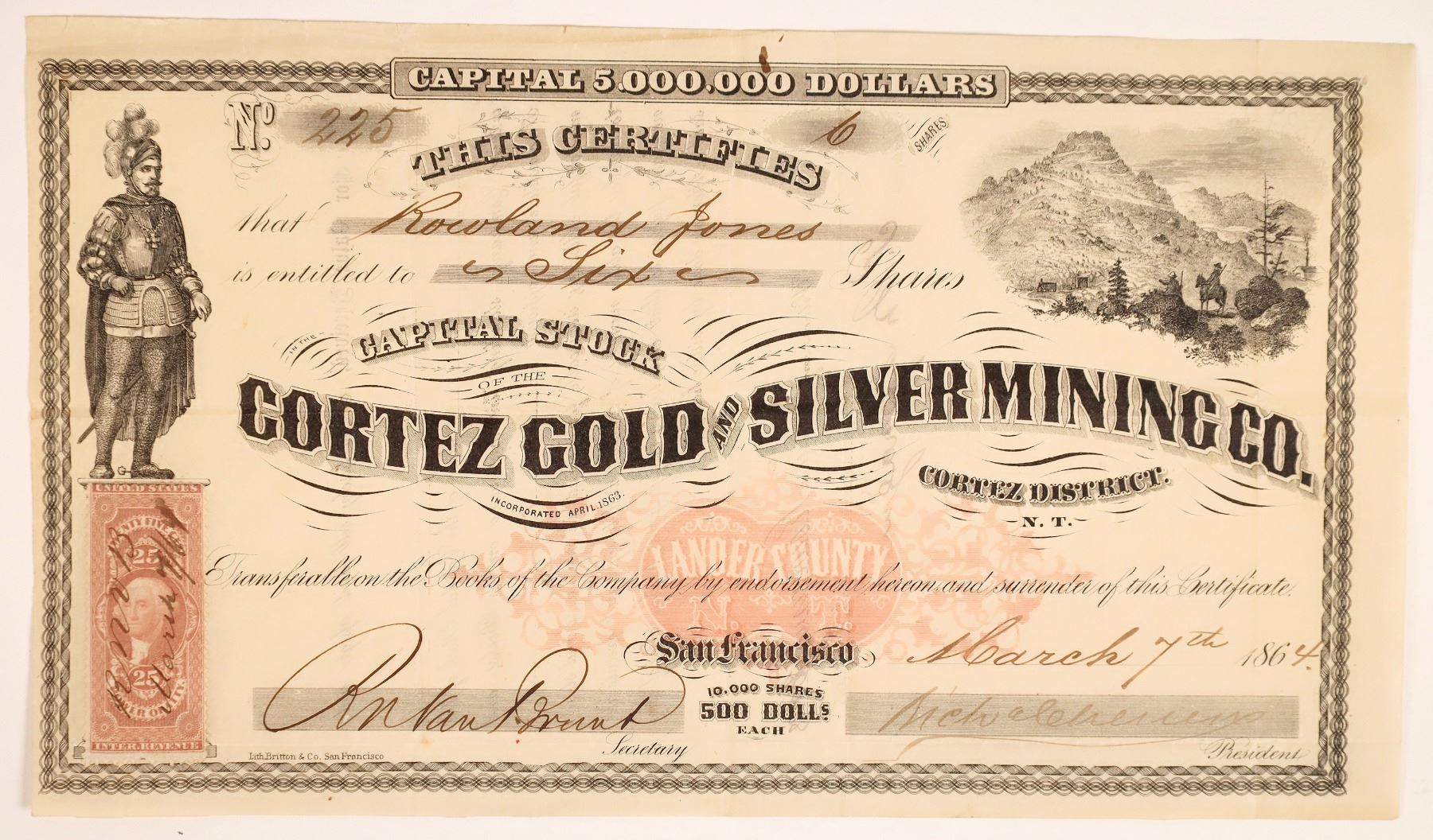 Rare Nevada Territorial Mining Company. # 225 for 6 shares to Orland Jones. Signed by president (?) and secretary RN Van Prunt. Dateline San Francisco March 7, 1864. Incorporated July 24, 1863. Not cancelled. 25c revenue stamp. Two Loomis vignettes. One of Senior Cortez and the other of a lone miner in front of a large mountain. Location of mines: Big Creek District, Lander County, N. T. Has the famous 'Land County, N. T.' apple. Shares are $500 Dollars each. Some small issues, but overall very nice!!