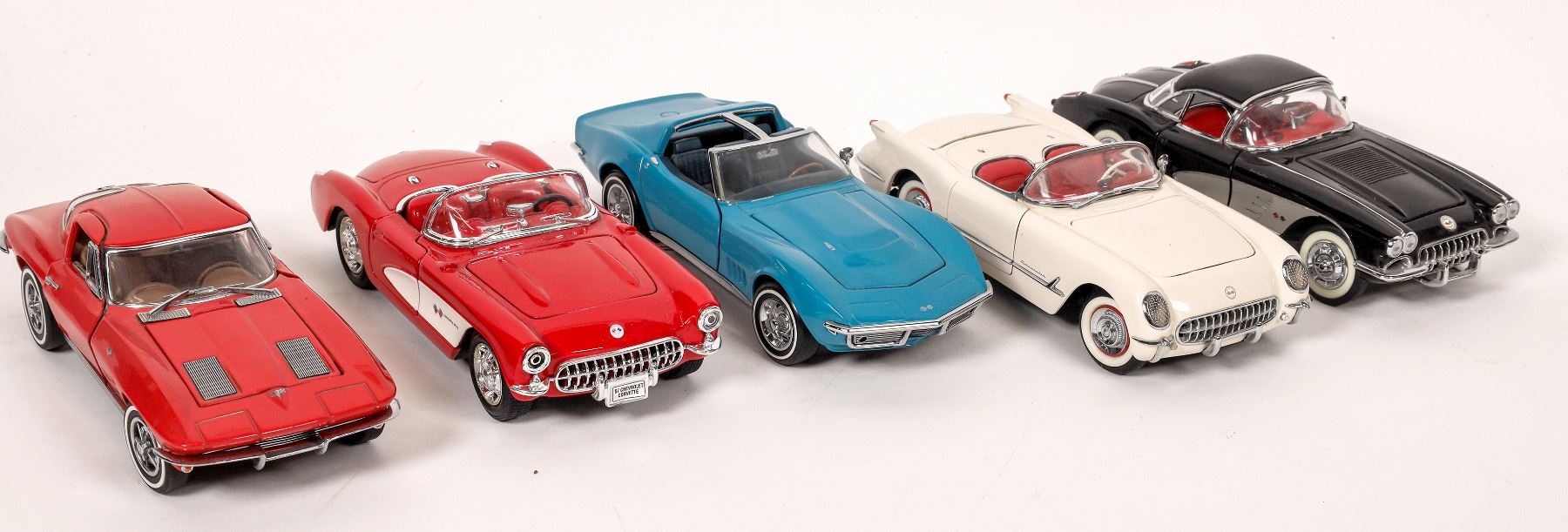 5 Corvette diecasts. Black 1958 hardtop by Franklin Mint, no scale, 7" long. White 1953 by Franklin Mint, no scale, 7". Blue 1968 T Top by Franklin Mint, no scale, 7.5" long. Red 1963 by Franklin Mint, no scale, 7.25" long. Red 1957 by Welly, 1/12 scale.