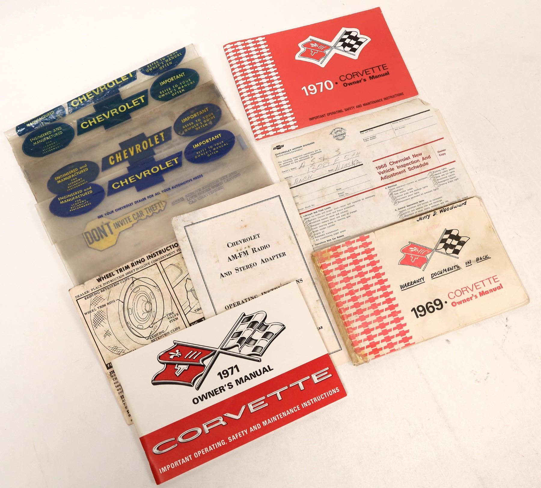 This lot contains four Corvette owner's manual slips. One is dated 2-16-66 part number 3834959; two are 3-19-68 part number 3950779; the fourth one is not legible for date or part number. They are wrinkled, stained, and worn. Why own a reproduction when you can own a worn original part? Get the original parts for NCRS points. The lot also includes the glovebox card for trim ring removal for the '67 model dated 9-66 part no. 3913832; foxed, stained, and tipped corner but all original. The AM-FM Radio operating Instruction manual dated at 11-8-67 for the '68 Corvette part no. 7306110. The pages are stuck together but intact and all original. There is an owner's manual for a 1968 Corvette, poor condition heavily notated; owner's manual for the 1970 Corvette, excellent condition part no. 3970067; owner's manual for the 1971 Corvette second edition Feb. 1971, part No. 3991062st 310-71. The owner's manuals look correct and not reproduction.