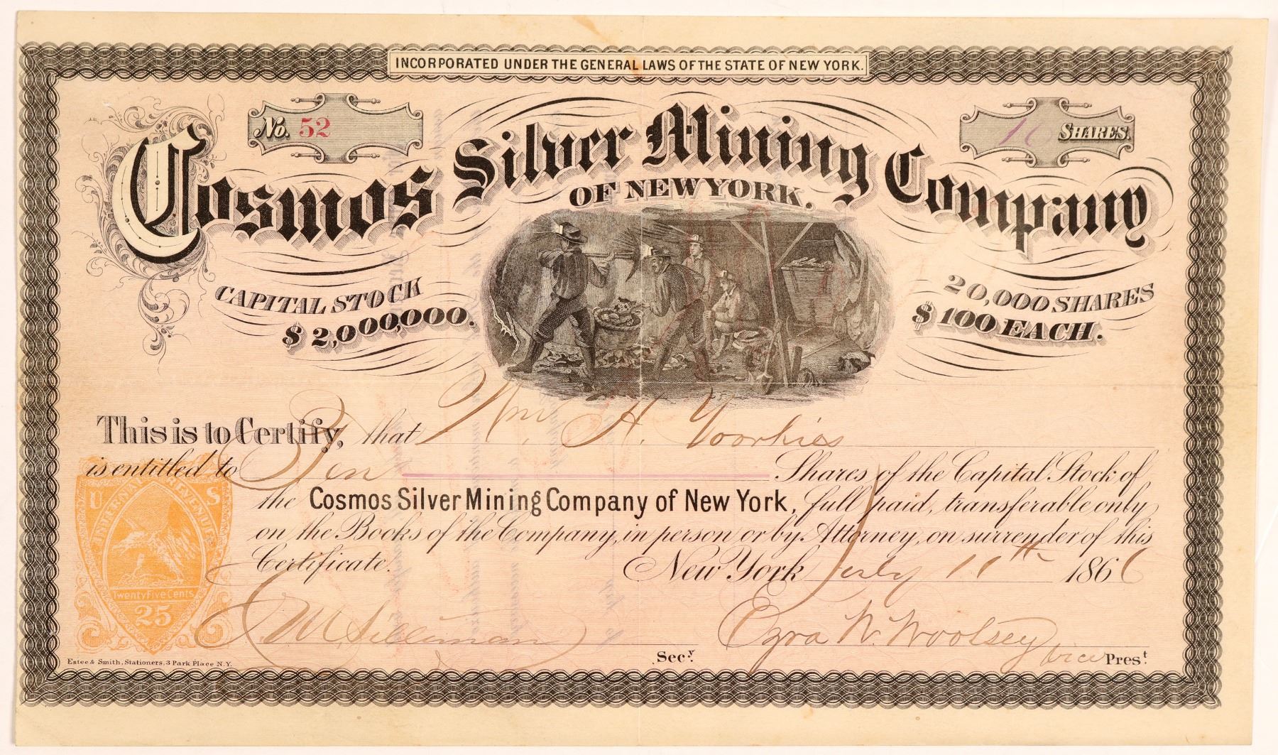 Rare choice stock with imprinted revenue. #52 I/U Wm Yoorhis 10 shares 1866, signed by Vice President Ezra Woolsey. Originally purchased in 1999 for $1175. Great for RN collectors. Fantastic!