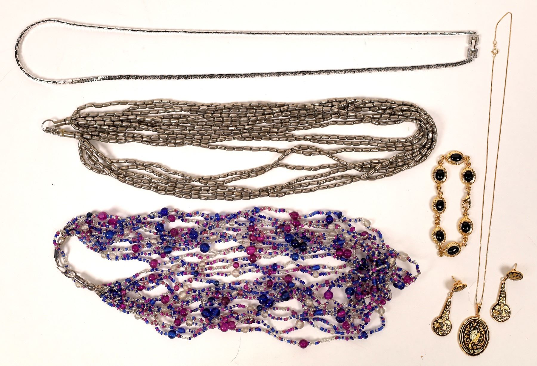 This is a cache of three necklaces; one box chain, one tube chain, one beaded necklace. One faux stone bracelet, one pendant with chain and matching earrings. Please see photos for details.