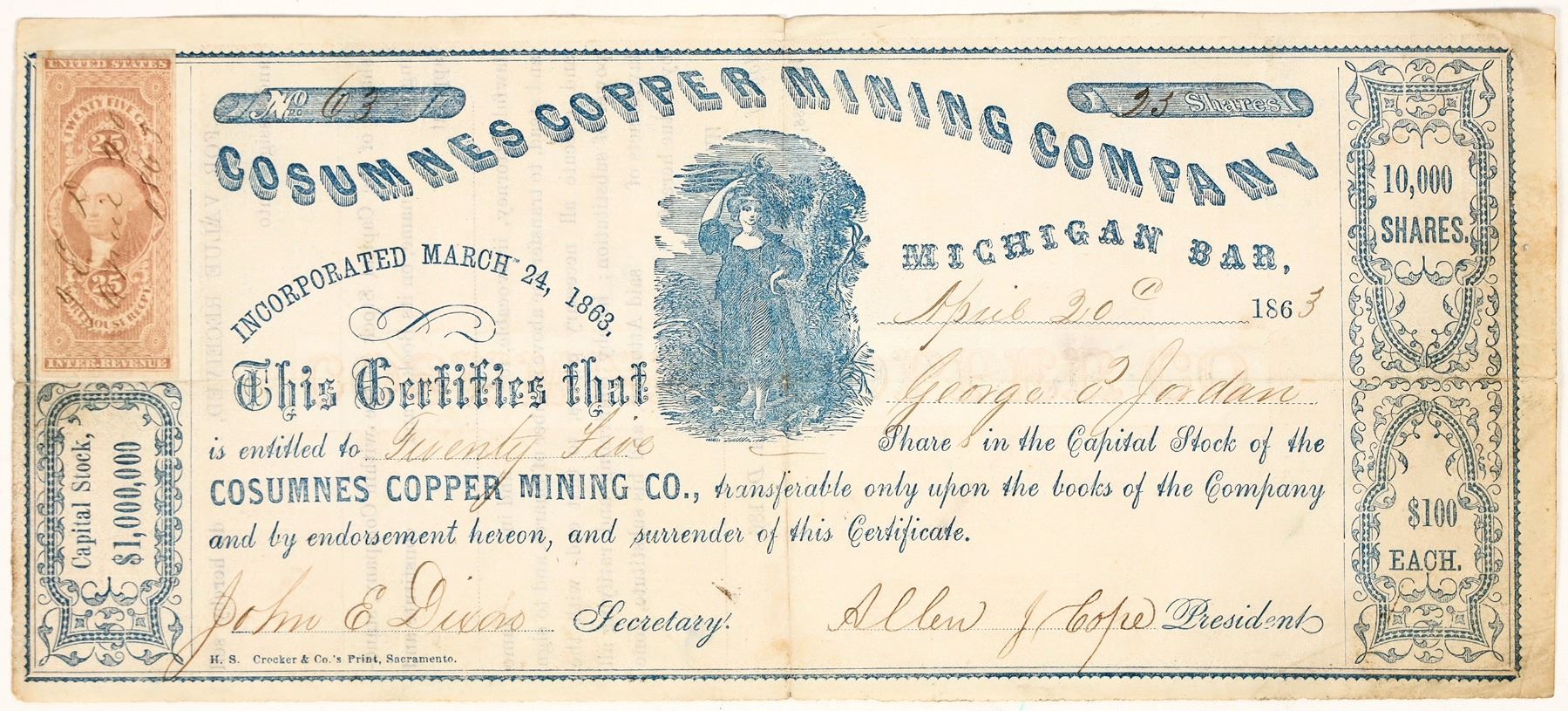 Inc. March 1863. No. 63, issued for 25 shares to George Jordan at Michigan Bar, April 1863. Signed by president Allen Cope and secretary John Dixon. Not cancelled. Blue print and allegorical vignette. 25 cent revenue stamp at upper left. Heavy folds, some soiling. This company operated a mine on the Middle Fork of the Cosumnes River four miles east of Fair Play, El Dorado County.