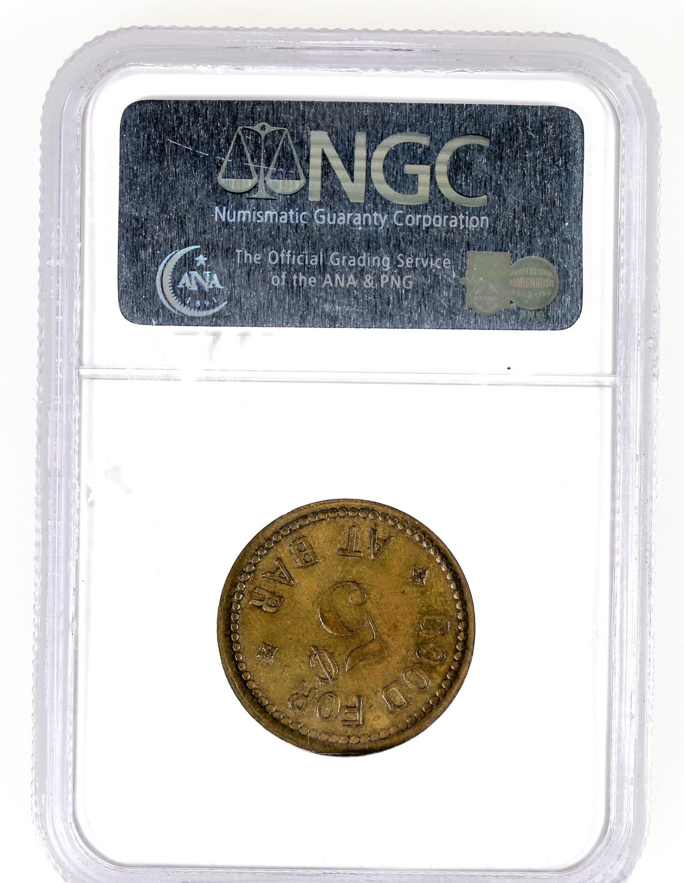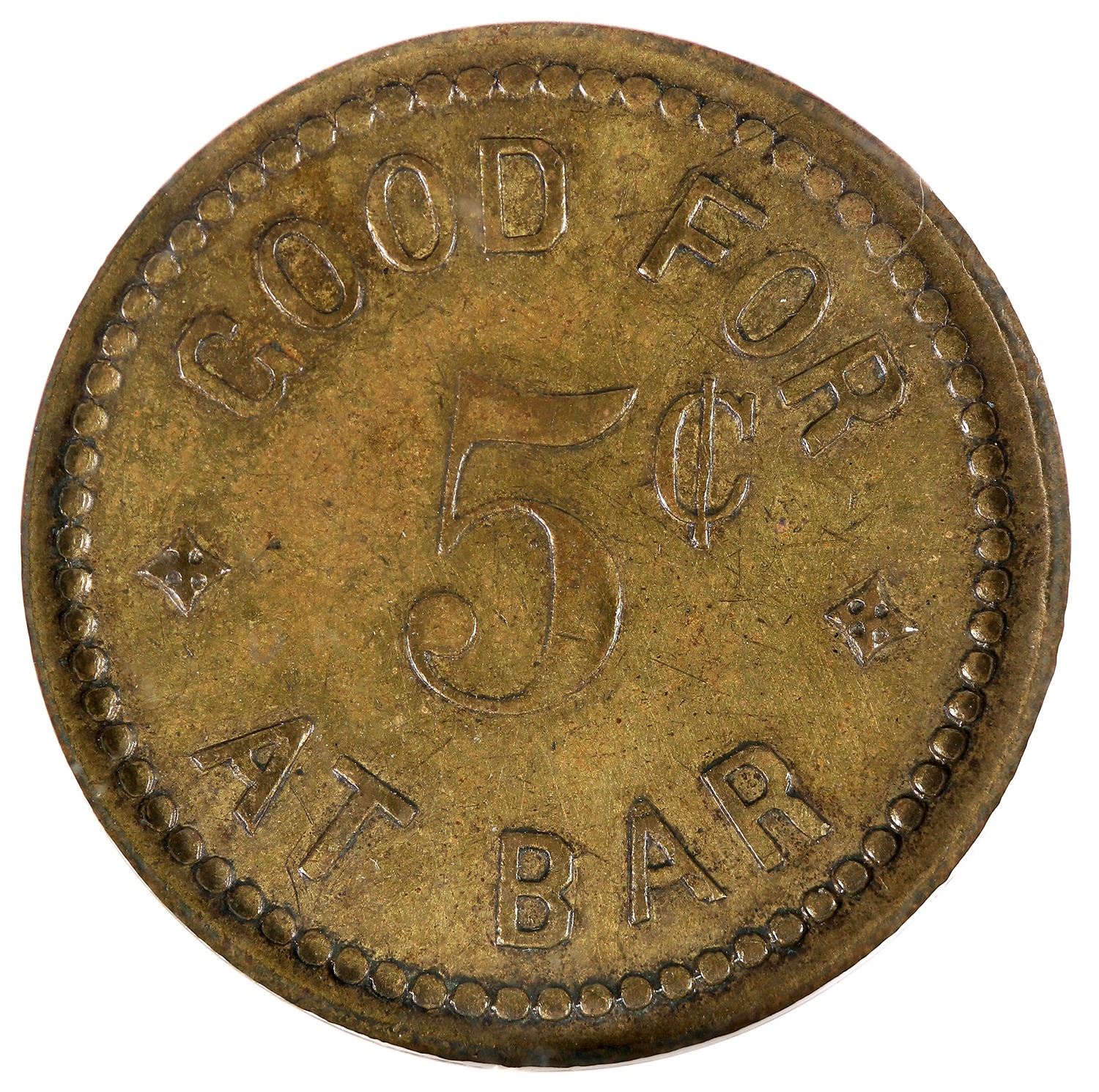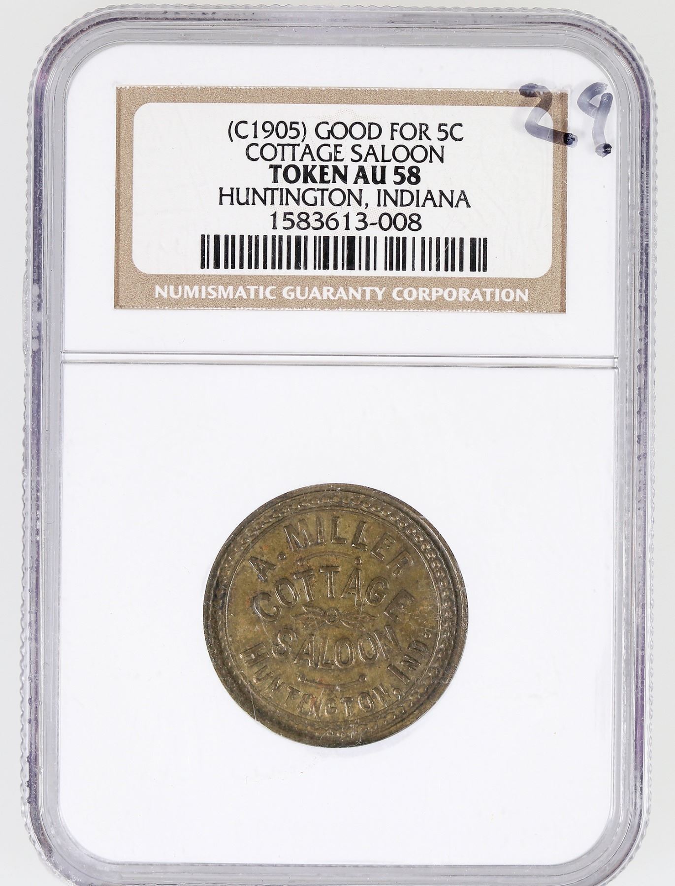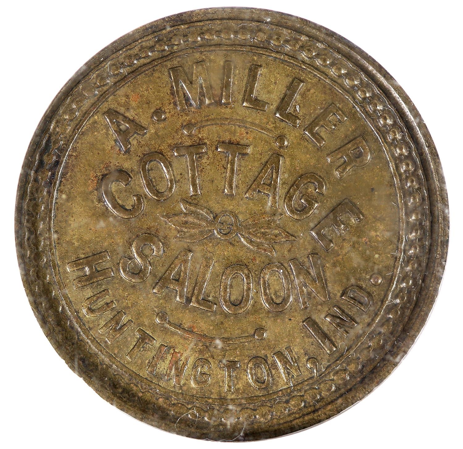 NGC certified AU 58: A. MILLER / COTTAGE / SALOON / HUNTINGTON, IND. // GOOD FOR / 5¢ / AT BAR; Br., rd., 26 mm.