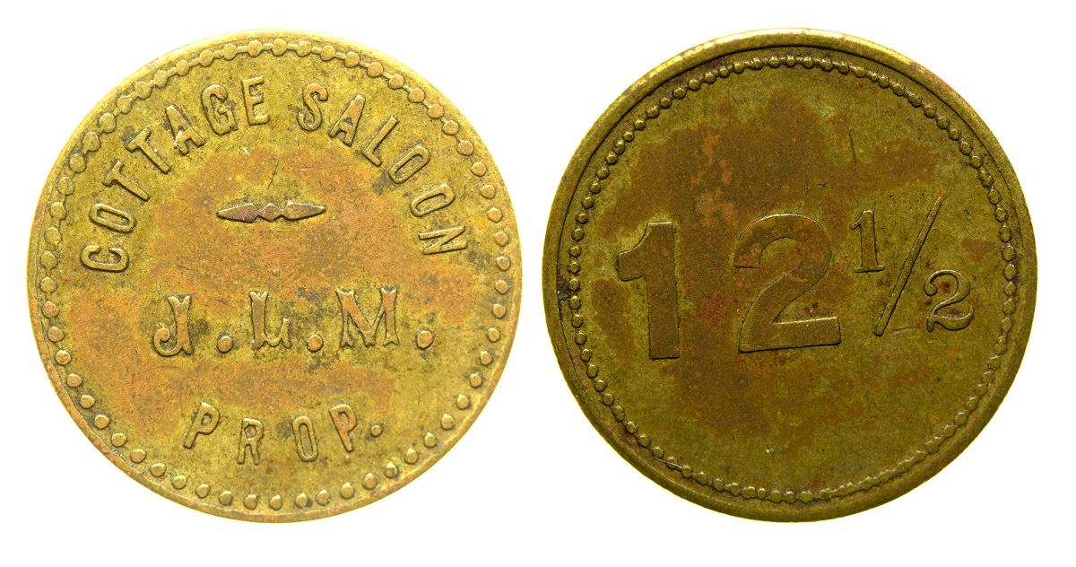 R-8, early Utica. Cottage Saloon / J. L. M. / Prop. // GF / 12-1/2c / IT. Round, brass, 24mm. (Svoboda Collection) City: Utica State: Montana Date: HWAC# 35834