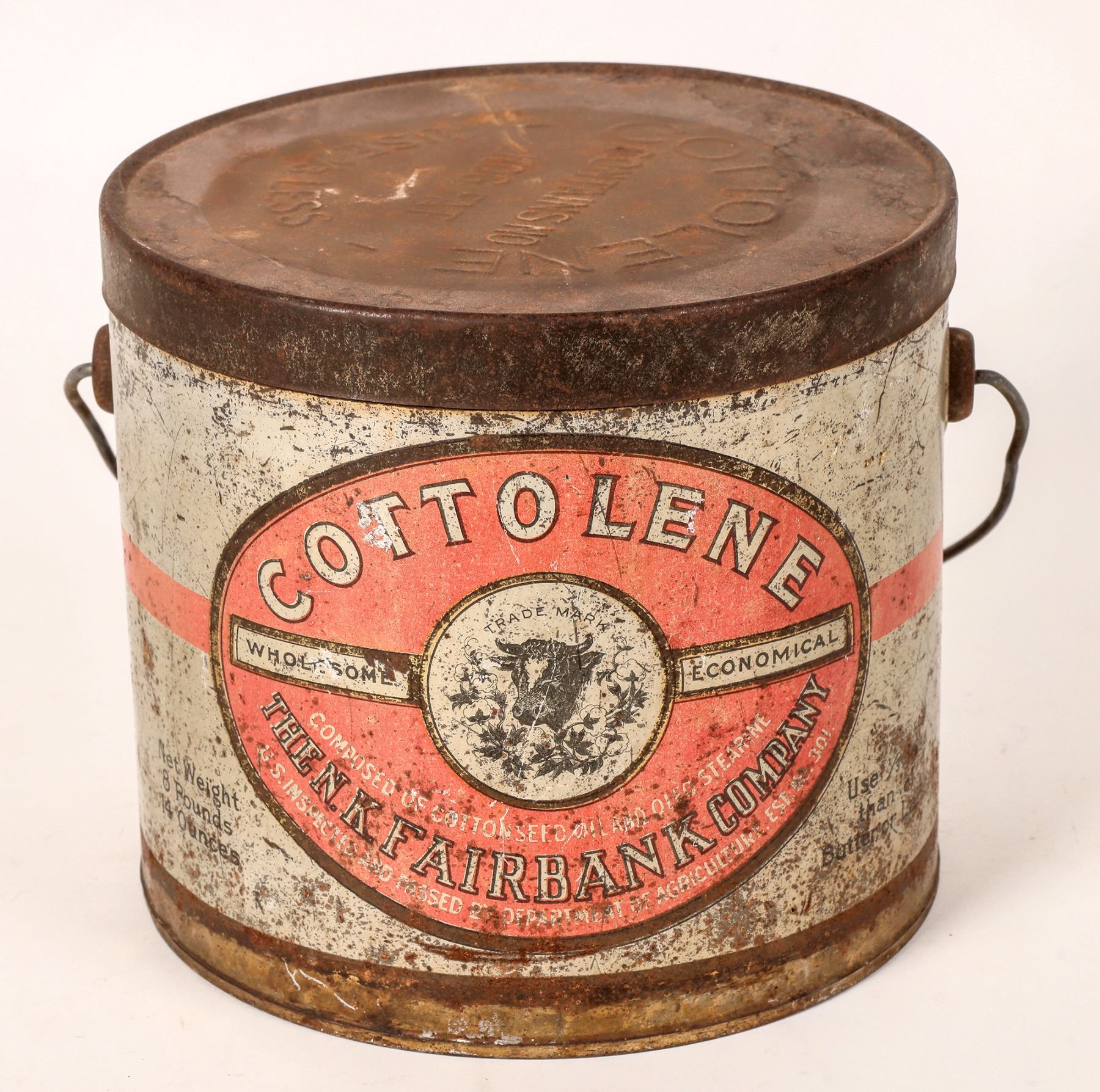 An eight (8) pound 14 ounce metal container that once contained "Cottolene" a product designed to replace standard lard and butter by combining the oil left over from both beef suet and cotton seed oil. This product was made by the N.K. Fairbanks Company of Chicago. Tin has some rust issues but is srill great for display. Please see photos for more details. Illinois Chicago 1900s